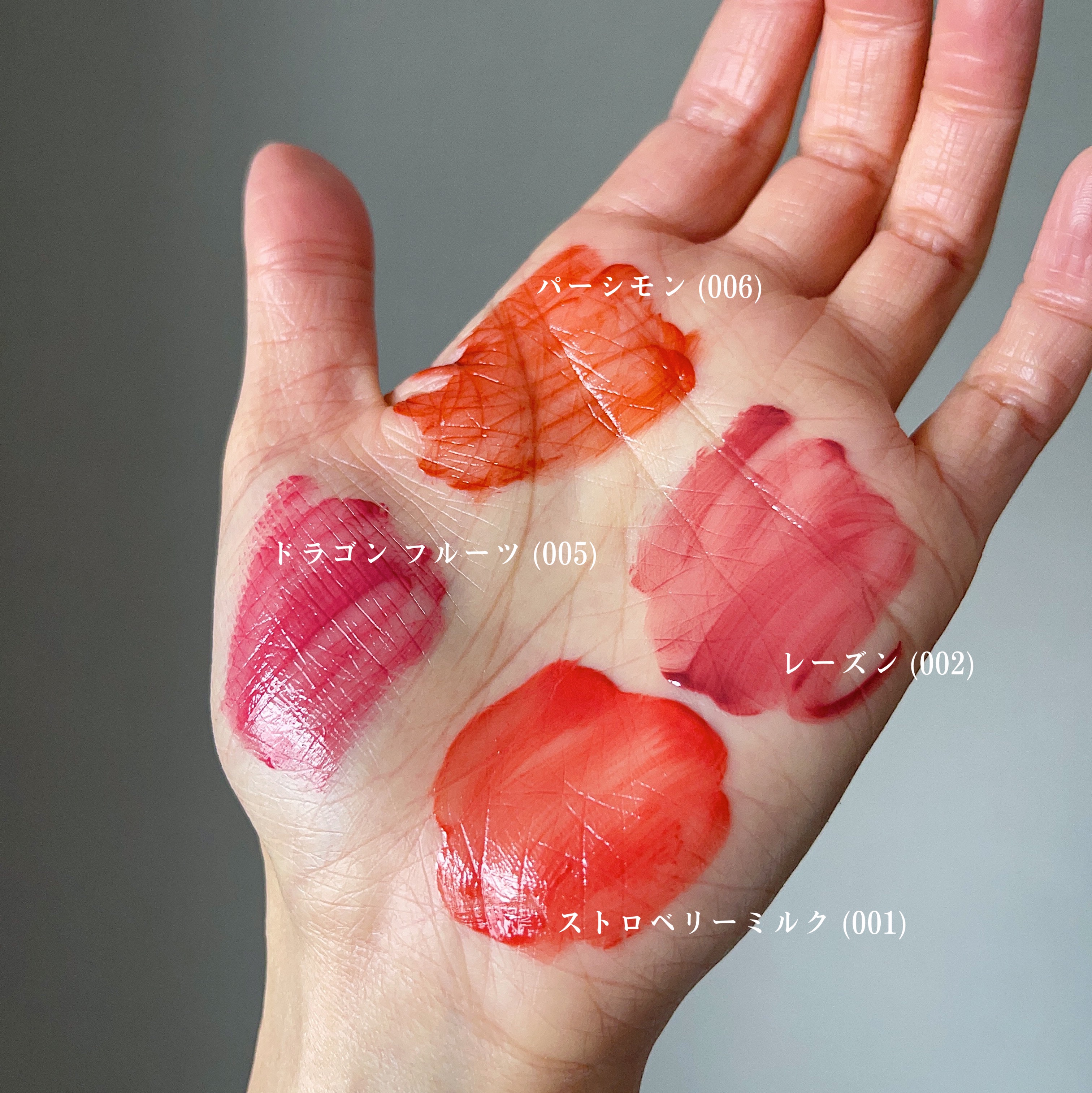 - <002 レーズン> 水、ダイマージリノール酸ダイマージリノレイルビス(ベヘニル/イソステアリル/フィトステリル)、グリセリン、BG、リンゴ酸ジイソステアリル、水添ポリシクロペンタジエン、トリ(カプリル酸/カプリン酸)グリセリル、水添ポリイソブテン、トリイソステアリン酸ポリグリセリル-2、イソドデカン、ジグリセリン、(アクリル酸ヒドロキシエチル/アクリロイルジメチルタウリンNa)コポリマー、ステアレス-21、1,2-ヘキサンジオール、イソステアリン酸ソルビタン、ヒドロキシアセトフェノン、トリ脂肪酸(C10-18)グリセリル、スクワラン、(アジピン酸/カプリン酸/カプリル酸/ヘプタン酸)ペンタエリスリチル、メントキシプロパンジオール、クエン酸、酢酸トコフェロール、ポリソルベート60、テトラ(ジ-t-ブチルヒドロキシヒドロケイヒ酸)ペンタエリスリチル、水酸化Al、トリエトキシカプリリルシラン [+/-] 酸化チタン、酸化鉄、赤202、赤227、黄4、黄5、青2 <005 ドラゴン フルーツ> 水、ダイマージリノール酸ダイマージリノレイルビス(ベヘニル/イソステアリル/フィトステリル)、グリセリン、BG、リンゴ酸ジイソステアリル、水添ポリシクロペンタジエン、トリ(カプリル酸/カプリン酸)グリセリル、水添ポリイソブテン、トリイソステアリン酸ポリグリセリル-2、イソドデカン、ジグリセリン、(アクリル酸ヒドロキシエチル/アクリロイルジメチルタウリンNa)コポリマー、ステアレス-21、1,2-ヘキサンジオール、イソステアリン酸ソルビタン、ヒドロキシアセトフェノン、トリ脂肪酸(C10-18)グリセリル、スクワラン、(アジピン酸/カプリン酸/カプリル酸/ヘプタン酸)ペンタエリスリチル、メントキシプロパンジオール、クエン酸、酢酸トコフェロール、ポリソルベート60、テトラ(ジ-t-ブチルヒドロキシヒドロケイヒ酸)ペンタエリスリチル、水酸化Al、トリエトキシカプリリルシラン [+/-] 酸化チタン、酸化鉄、赤202、赤227、黄4、黄5、青3 <007 ウォルナット> 水、ダイマージリノール酸ダイマージリノレイルビス(ベヘニル/イソステアリル/フィトステリル)、グリセリン、BG、リンゴ酸ジイソステアリル、水添ポリシクロペンタジエン、トリ(カプリル酸/カプリン酸)グリセリル、水添ポリイソブテン、トリイソステアリン酸ポリグリセリル-2、イソドデカン、ジグリセリン、(アクリル酸ヒドロキシエチル/アクリロイルジメチルタウリンNa)コポリマー、ステアレス-21、1,2-ヘキサンジオール、イソステアリン酸ソルビタン、ヒドロキシアセトフェノン、トリ脂肪酸(C10-18)グリセリル、スクワラン、(アジピン酸/カプリン酸/カプリル酸/ヘプタン酸)ペンタエリスリチル、メントキシプロパンジオール、クエン酸、酢酸トコフェロール、ポリソルベート60、テトラ(ジ-t-ブチルヒドロキシヒドロケイヒ酸)ペンタエリスリチル、水酸化Al、トリエトキシカプリリルシラン [+/-] 酸化チタン、酸化鉄、赤202、赤227、黄4、黄5、青1 <009 ルバーブ> 水、ダイマージリノール酸ダイマージリノレイルビス(ベヘニル/イソステアリル/フィトステリル)、グリセリン、BG、リンゴ酸ジイソステアリル、水添ポリシクロペンタジエン、トリ(カプリル酸/カプリン酸)グリセリル、水添ポリイソブテン、トリイソステアリン酸ポリグリセリル-2、イソドデカン、ジグリセリン、(アクリル酸ヒドロキシエチル/アクリロイルジメチルタウリンNa)コポリマー、ステアレス-21、1,2-ヘキサンジオール、イソステアリン酸ソルビタン、ヒドロキシアセトフェノン、トリ脂肪酸(C10-18)グリセリル、スクワラン、メントキシプロパンジオール、クエン酸、(アジピン酸/カプリン酸/カプリル酸/ヘプタン酸)ペンタエリスリチル、酢酸トコフェロール、ポリソルベート60、テトラ(ジ-t-ブチルヒドロキシヒドロケイヒ酸)ペンタエリスリチル、トリエトキシカプリリルシラン [+/-] 酸化チタン、酸化鉄、赤202、赤227、黄4、黄5、青1 <001 ストロベリーミルク> 水、ダイマージリノール酸ダイマージリノレイルビス(ベヘニル/イソステアリル/フィトステリル)、グリセリン、BG、リンゴ酸ジイソステアリル、水添ポリシクロペンタジエン、トリ(カプリル酸/カプリン酸)グリセリル、水添ポリイソブテン、トリイソステアリン酸ポリグリセリル-2、イソドデカン、ジグリセリン、(アクリル酸ヒドロキシエチル/アクリロイルジメチルタウリンNa)コポリマー、ステアレス-21、1,2-ヘキサンジオール、イソステアリン酸ソルビタン、ヒドロキシアセトフェノン、トリ脂肪酸(C10-18)グリセリル、スクワラン、(アジピン酸/カプリン酸/カプリル酸/ヘプタン酸)ペンタエリスリチル、メントキシプロパンジオール、クエン酸、酢酸トコフェロール、ポリソルベート60、テトラ(ジ-t-ブチルヒドロキシヒドロケイヒ酸)ペンタエリスリチル、水酸化Al、トリエトキシカプリリルシラン [+/-] 酸化チタン、酸化鉄、赤202、赤227、黄4、黄5、青1 <004 ダーク チェリー> 水、ダイマージリノール酸ダイマージリノレイルビス(ベヘニル/イソステアリル/フィ