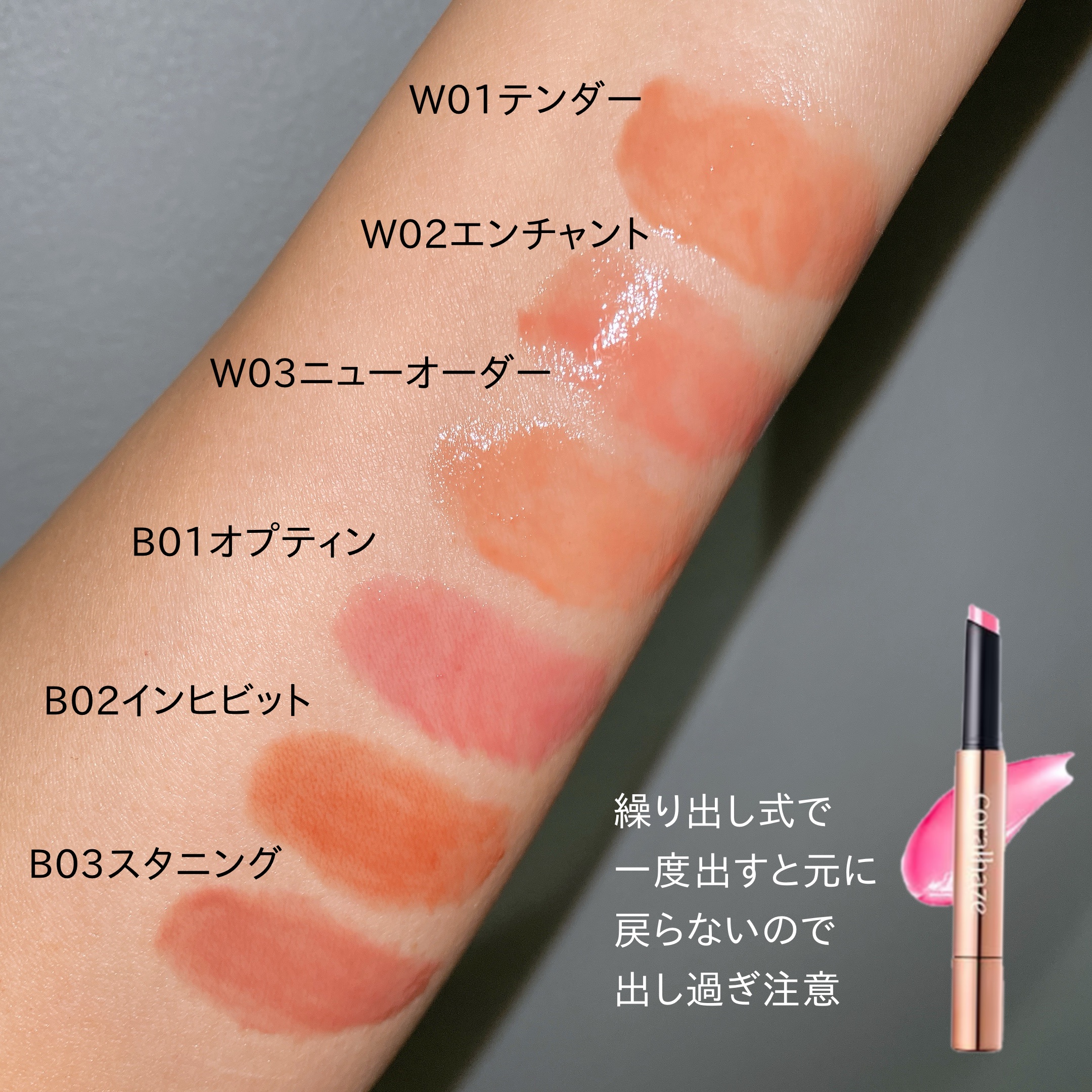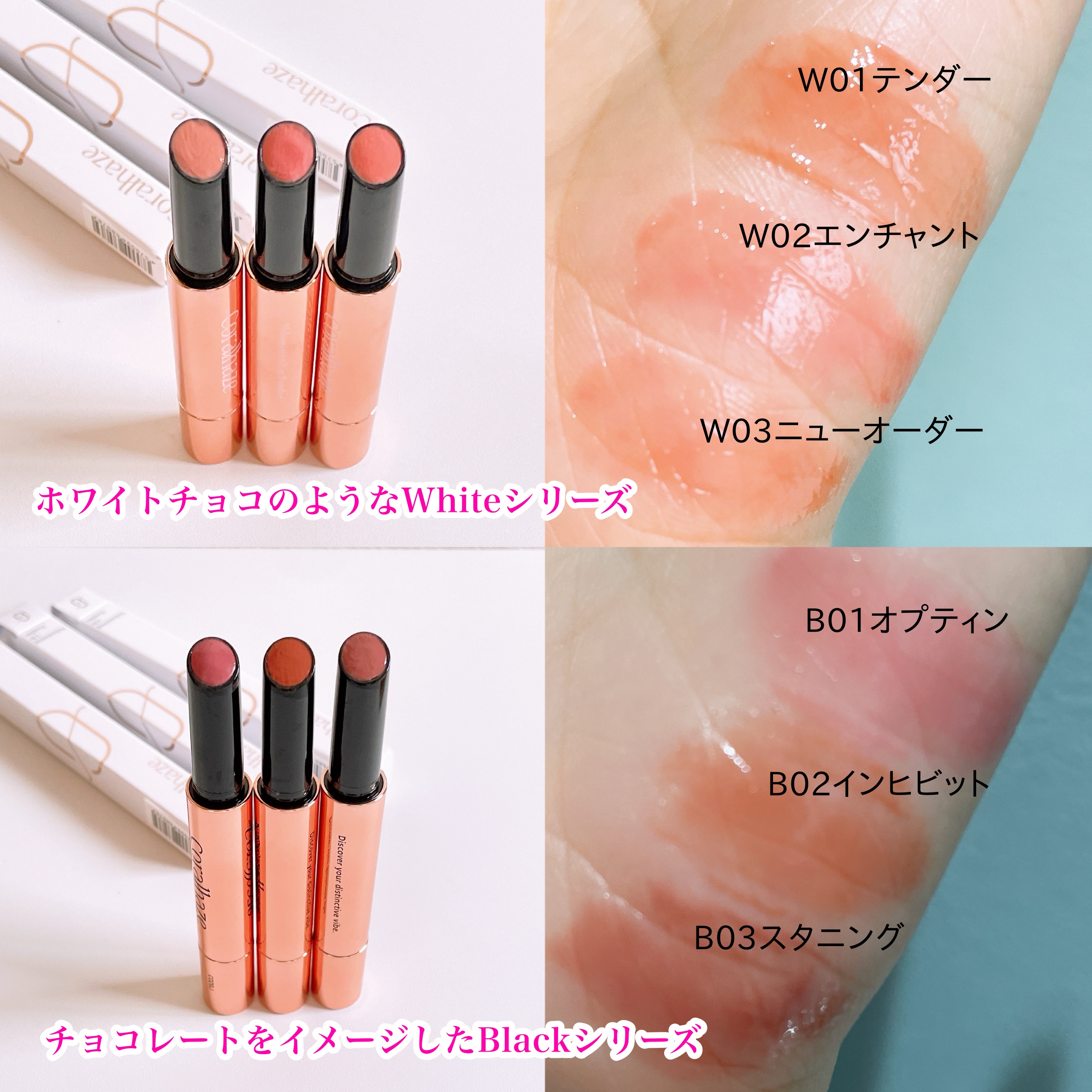 - White コンセプト / Blackコンセプトでお馴染みのCoralhazeから新たに6色追加となります。 特にBlackコンセプトに対する期待の声が寄せられていたこともあり、今回Black コンセプトから既存のBlack LineよりもさらにトーンダウンしたDark Lineが新登場。 番号の前にWが付いている商品はwhite Line、Bがついている商品はBlack Line、Dが付いている商品はDark Lineとなります。 1.唇に軽くメルティングされ蜂蜜を塗ったようなプルンとした輝きを与えます 2.プランパー成分配合でクーリング感とともにふっくらとしたボリューム、ツヤ感を与えます 3.ベタつきの少ないテクスチャーで重ね塗りしても快適に使用 4.パーソナルカラーに合わせて選べる10種類のカラー 5.高級感のあるゴールド色の容器を使用し感性的な満足感をお届けします 6.唇を保護し、保湿感を与えるスキンケア成分を配合 韓国では 「自身が持っている魅力をコーラルヘイズがより引き出す」 というパステルカラー調のコンセプトになっておりますが日本では今までの韓国コスメにはない、Black or White コンセプトになっております。 Black Lineはブラウンチョコレートを一滴垂らしたようなカラー White Lineは生クリームを一滴垂らしたようなカラー