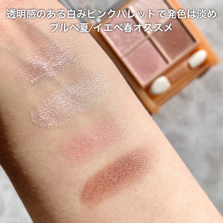 先行発売でGETしたよ🙌 春らしいピーチピンクパレット♡ 桃の中でも白桃って感じの淡めピンク💡 上段2色がとっても透明感でるカラーだよ! 全体的に淡い発色だからナチュラル派や濃いメイクが苦手な方にオススメ! ブルベ夏が1番似合いそうな淡め白桃パレット🍑