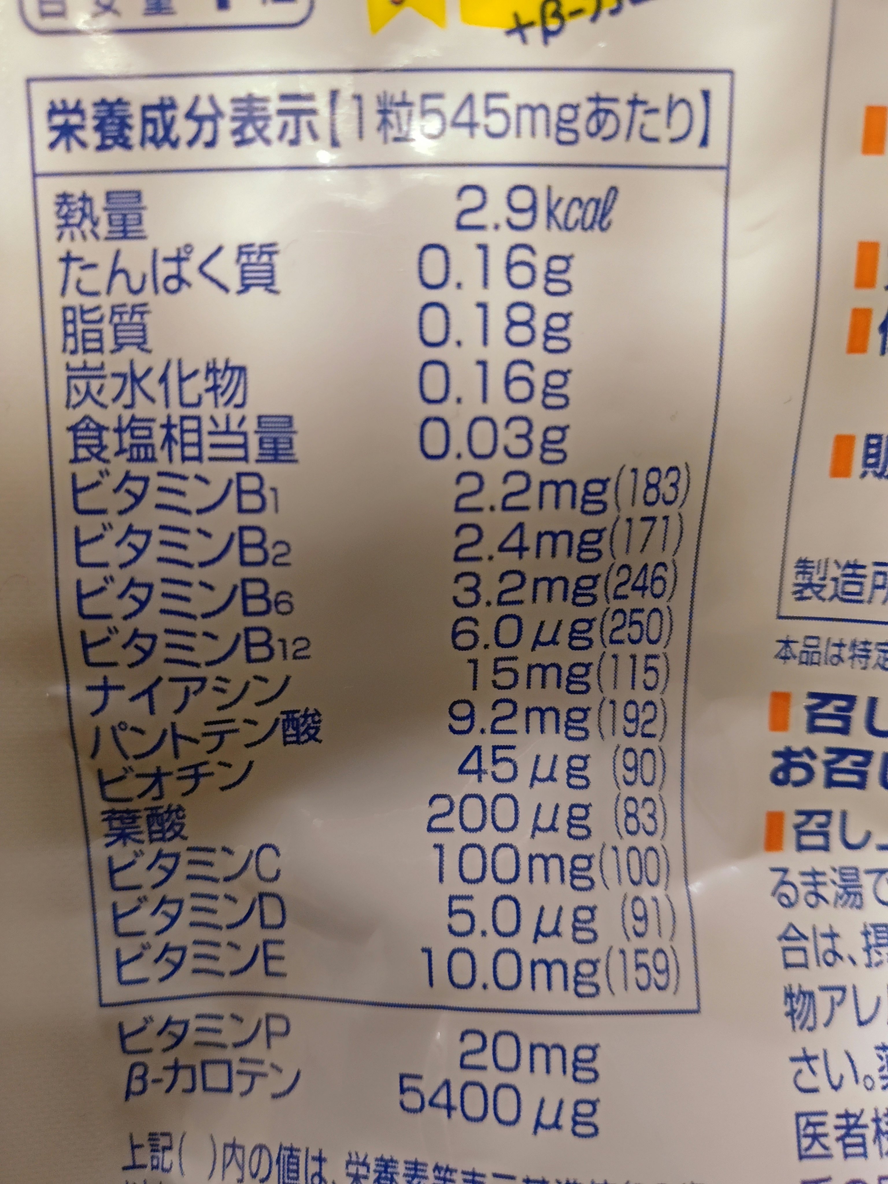 - 健康と美容を保つうえで欠かせないビタミン。 「マルチビタミン」は、11種類のビタミンとビタミンP、β-カロテンを1粒にバランスよく配合したサプリメントです。 手軽に補うことができます。 ※水またはぬるま湯でお召し上がりください。 ※本品は、多量摂取により疾病が治癒したり、より健康が増進するものではありません。一日の摂取目安量を守ってください。 ※葉酸は、胎児の正常な発育に寄与する栄養素ですが、多量摂取により胎児の発育がよくなるものではありません。 ※本品は、特定保健用食品と異なり、消費者庁長官による個別審査を受けたものではありません。 【飲み方】 1日の目安1粒で、現代人に不足しがちなビタミン13種類をまとめて効率よく摂取できます。 【栄養機能表示】 ・ナイアシン、パントテン酸、ビオチン、ビタミンB2、β-カロテンは、皮膚や粘膜の健康維持を助ける栄養素です。 ・ビタミンB1は、炭水化物からのエネルギー産生と皮膚や粘膜の健康維持を助ける栄養素です。 ・ビタミンB6は、たんぱく質からのエネルギー産生と皮膚や粘膜の健康維持を助ける栄養素です。 ・ビタミンB12、葉酸は、赤血球の形成を助ける栄養素です。 ・ビタミンCは、皮膚や粘膜の健康維持を助けるとともに、抗酸化作用をもつ栄養素です。 ・ビタミンEは、抗酸化作用により、体内の脂質を酸化から守り、細胞の健康維持を助ける栄養素です。 ・葉酸は、胎児の正常な発育に寄与する栄養素です。 ※葉酸は、胎児の正常な発育に寄与する栄養素ですが、多量摂取により胎児の発育が良くなるものではありません。 ・β-カロテンは、夜間の視力の維持を助ける栄養素です。 ・ビタミンDは、腸管でのカルシウムの吸収を促進し、骨の形成を助ける栄養素です。 【名称】 ビタミン類含有食品 【原材料名】 オリーブ油(スペイン製造)/ゼラチン、ビタミンC、グリセリン、酵素処理ルチン、ナイアシン、へスぺリジン、ビタミンE、パントテン酸Ca、ミツロウ、デュナリエラカロテン、ビタミンB6、ビタミンB2、ビタミンB1、レシチン(大豆由来)、葉酸、ビオチン、ビタミンB12、ビタミンD3 【栄養成分表示[1粒545mgあたり]】 熱量2.9kcal、たんぱく質0.16g、脂質0.18g、炭水化物0.16g、食塩相当量0.03g、ビタミンB1 2.2mg(183)、ビタミンB2 2.4mg(171)、ビタミンB6 3.2mg(246)、ビタミンB12 6.0μg(250)、ナイアシン15mg(115)、パントテン酸9.2mg(192)、ビオチン45μg(90)、葉酸200μg(83)、ビタミンC 100mg(100)、ビタミンD 5.0μg(91)、ビタミンE 10.0mg(159)、ビタミンP 20mg、β-カロテン5400μg ※上記( )内の値は、栄養素等表示基準値(18歳以上、基準熱量2200kcal)に占める割合[%]です。 アレルギー物質 大豆 ゼラチン ※一日の目安量を守って、お召し上がりください。 ※お身体に異常を感じた場合は、摂取を中止してください。 ※特定原材料及びそれに準ずるアレルギー物質を対象範囲として表示しています。原材料をご確認の上、食物アレルギーのある方はお召し上がりにならないでください。 ※薬を服用中あるいは通院中の方、妊娠中の方は、お医者様にご相談の上お召し上がりください。 ●直射日光、高温多湿な場所をさけて保存してください。 ●お子様の手の届かないところで保管してください。 ●開封後はしっかり開封口を閉め、なるべく早くお召し上がりください。 食生活は、主食、主菜、副菜を基本に、食事のバランスを。