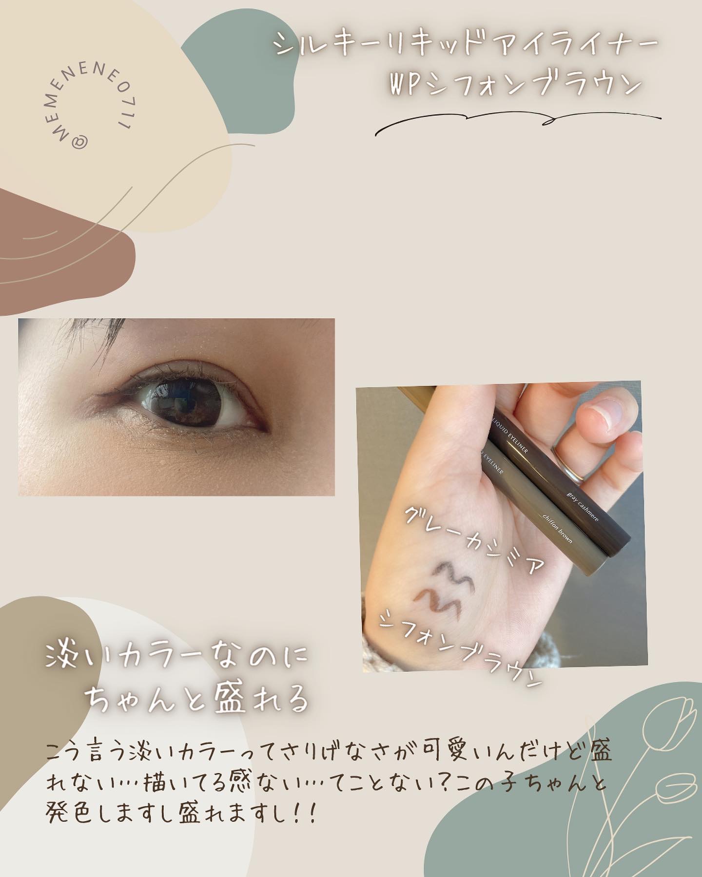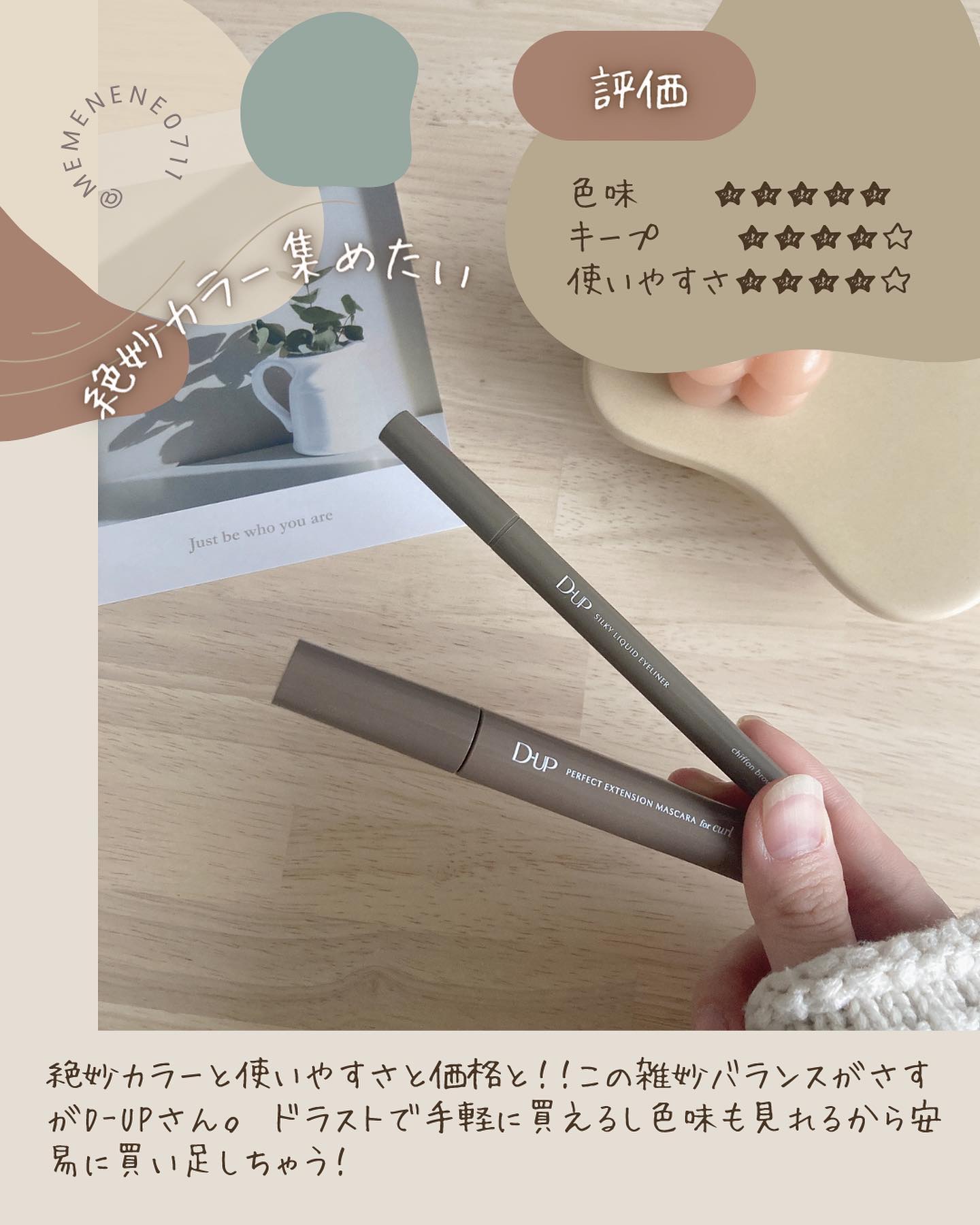 D-UP シルキーリキッドアイライナーWP シフォンブラウンは、描きやすさ、モチの良さで大ファンになりました。 シフォンブラウンはふわっと抜け感 ニュアンスカラーで、ブラウンでも、ベージュでも、グレーでもない曖昧さが可愛い色。 水、汗、皮脂に強く、落ちやすい目尻も1日キープと良いことづくし。