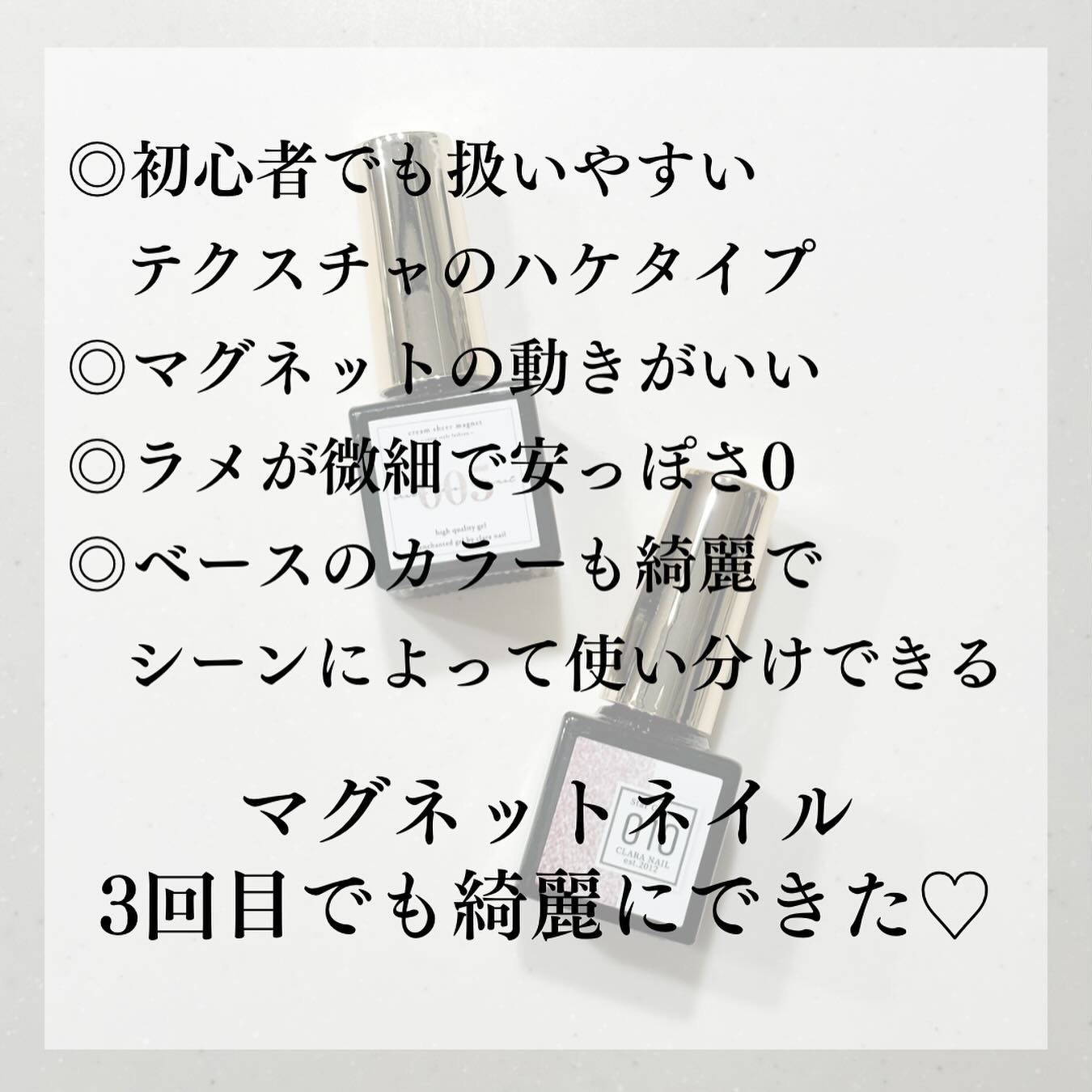初めて購入するシリーズなので比較のために別シリーズの似ていそうなカラーを購入したつもりだったのですが、見分けがつかないくらい同じでした🤣 ラメの大きさや量も大差はなさそう。 もしマグネットの具合が分からずどちらのシリーズから購入すればいいか迷っている方は単純に好きなカラーで選んでいいかと思います! 今回チョイスしたものはオフィスネイルとして良さそうな落ち着いたシンプルなカラーで使いやすかったです。 他のカラーも買い足そうと思います🫶💕