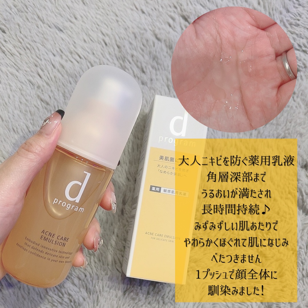 【私の肌質について】・脂性肌よりの混合肌・皮脂過多によるニキビができやすい(最近は頬の大人ニキビ跡に悩まされてる😢)・少し敏感肌・肌はすぐ焼ける※詳しくは前の投稿をご覧下さい👀dプログラムアクネケアエマルジョンMB#Qoo10メガ割#アクネケ...