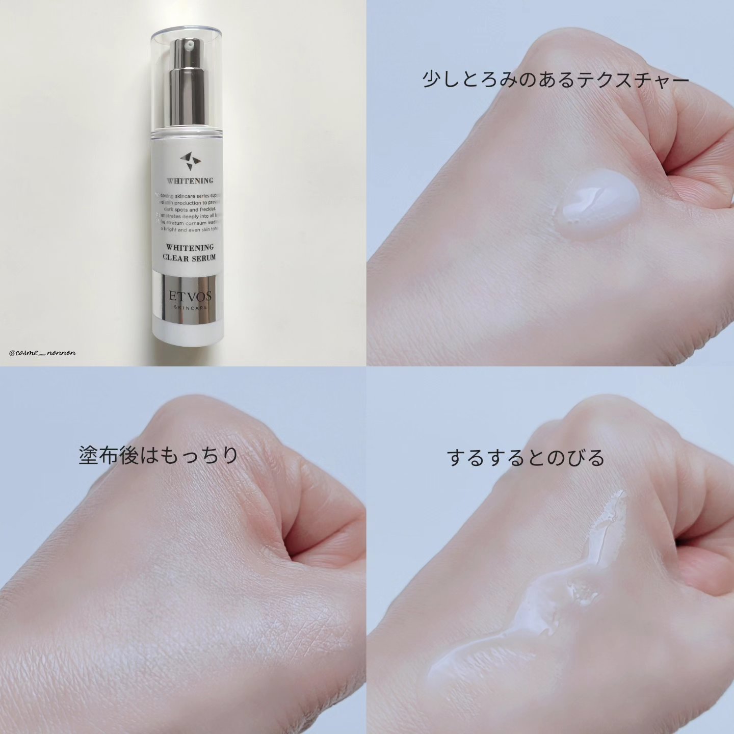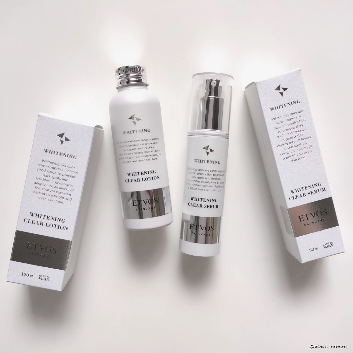 ETVOSの美白美容液がLDKのベスコスに選ばれました!敏感肌でもそうでなくても使ってほしい!美白*¹と保湿の両方を叶えちゃいます! ホワイトニングクリアは美白*¹と保湿の両方をケア。大人の肌には美白*¹も必要。 使用感がホワイトニングクリアのほうがさらっと軽くさっぱり。なのに、うるおい感は変わらずしっかりで