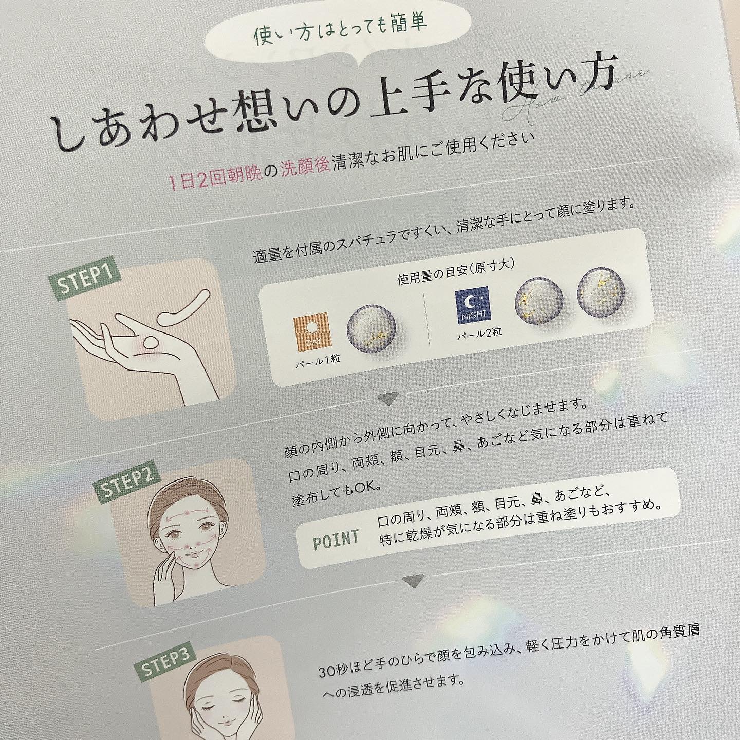 - オールインワンジェル『しあわせ想い』は、幸せのシンボルである四つ葉のクローバーから作られた成分*や、金沢産の高級金箔を配合。時短・美・幸運と、高品質スキンケア化粧品でありながら【縁起物】としての要素をプラスした、すっぴん笑顔が輝くスキンケア化粧品です。また3D形状記憶ジェル**によりお肌にハリを与え、高い弾力性を発揮。さらに独自処方成分により角質層への保湿成分の浸透力をサポートします。 *シロツメクサエキス(保湿成分) **形状を変化させても元の状態に戻るジェル