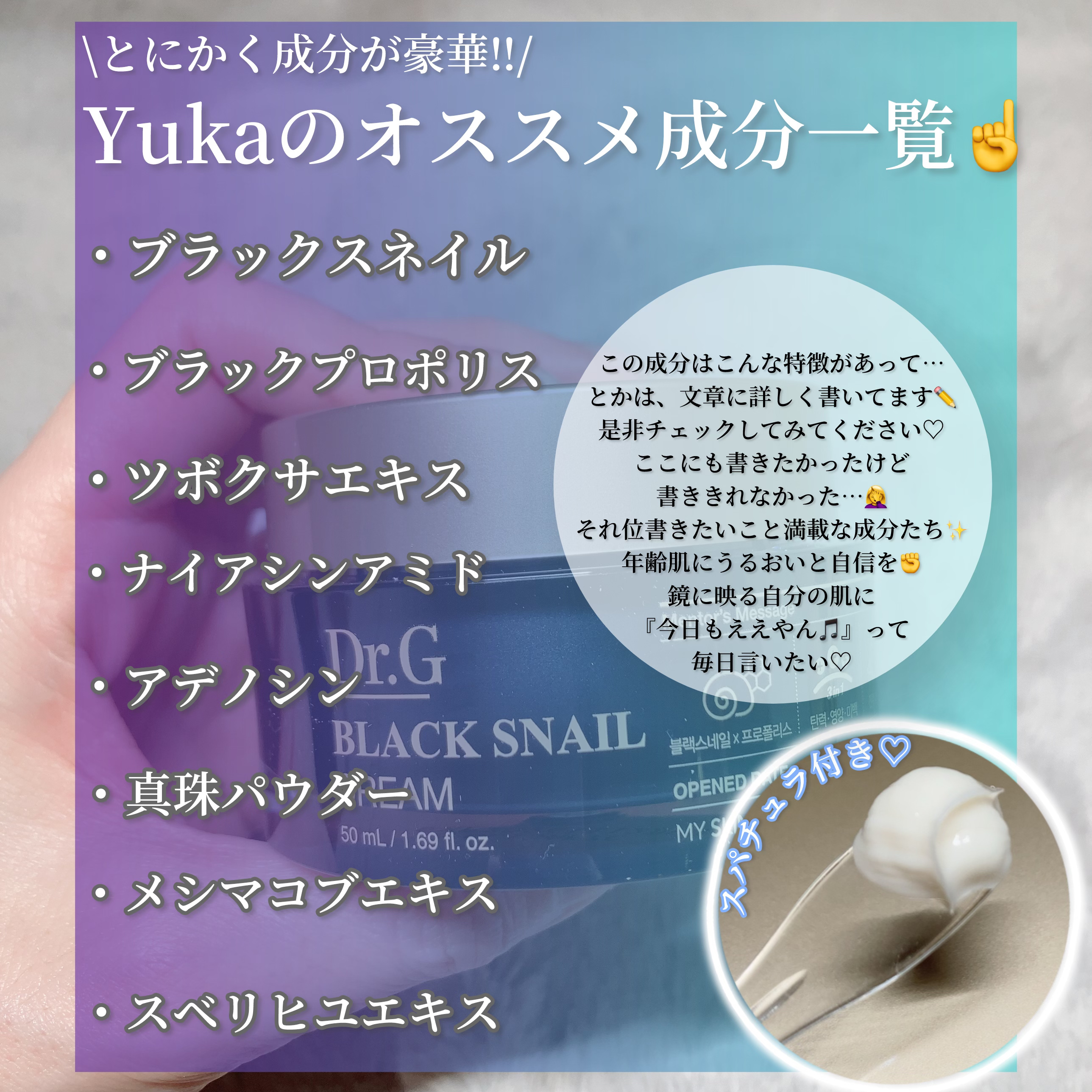 しっとり、もっちりが特徴のブラックスネイルシリーズのクリーム🖤 こっくりしたテクスチャがとろりと肌に馴染んで潤いつつ、ベタつかないのがすごくいい✨ ブラックスネイル&ブラックプロポリス 肌に栄養を与えて、みずみずしく 乾燥する季節にぴったりのしっかり保湿系クリームだよ🙌