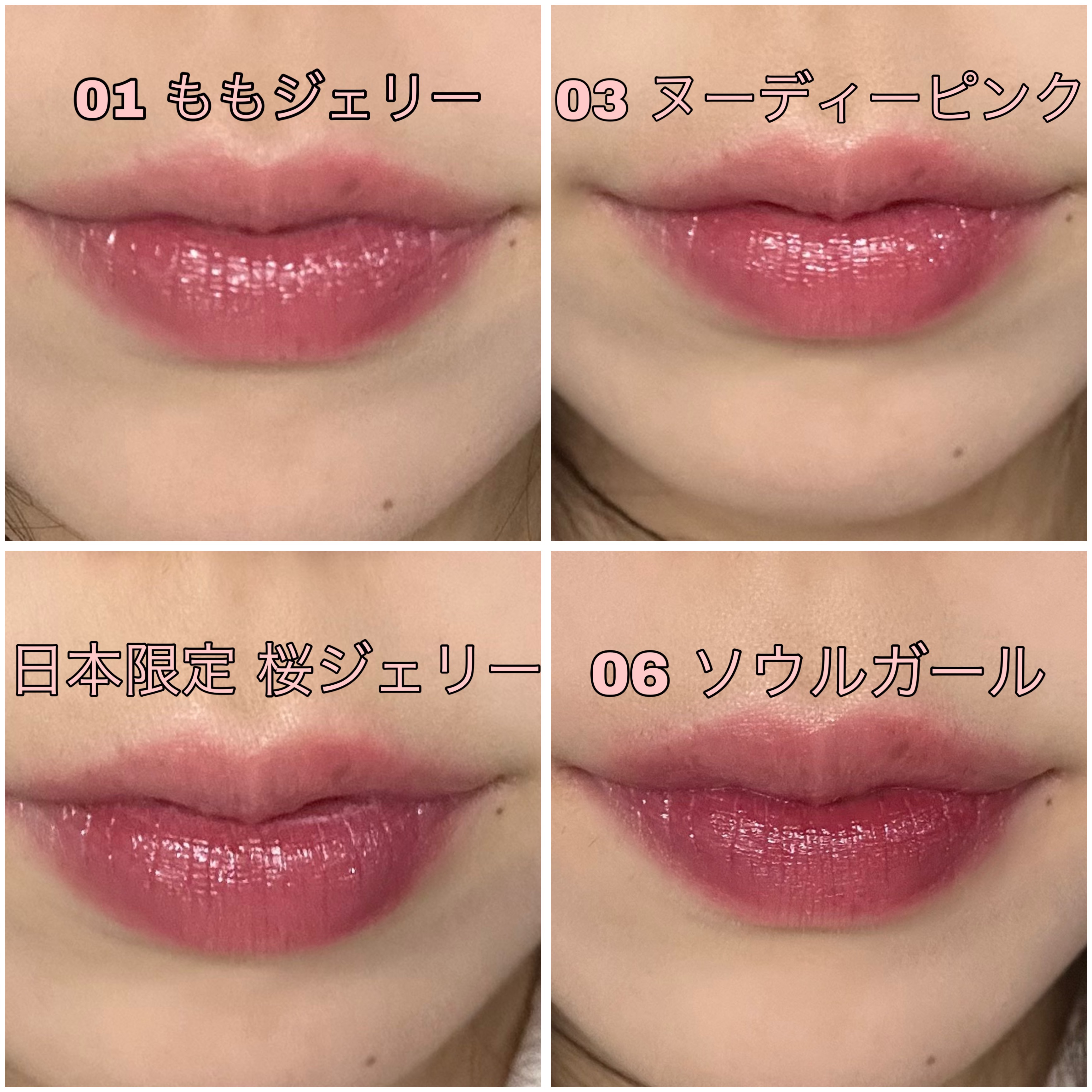 少し時間が経つとうるうるツヤツヤになってめっっちゃ可愛いです> ·̫ <♩ ももジェリー うるうるピンクって感じ 明るすぎず唇の色に馴染んでくれて赤ちゃんリップみたいになれます👶🏻💗 06ソールガール この4色でいちばん暗めで青みが強いのにマジで浮かないし意外と1番リップ塗りました感がでない!