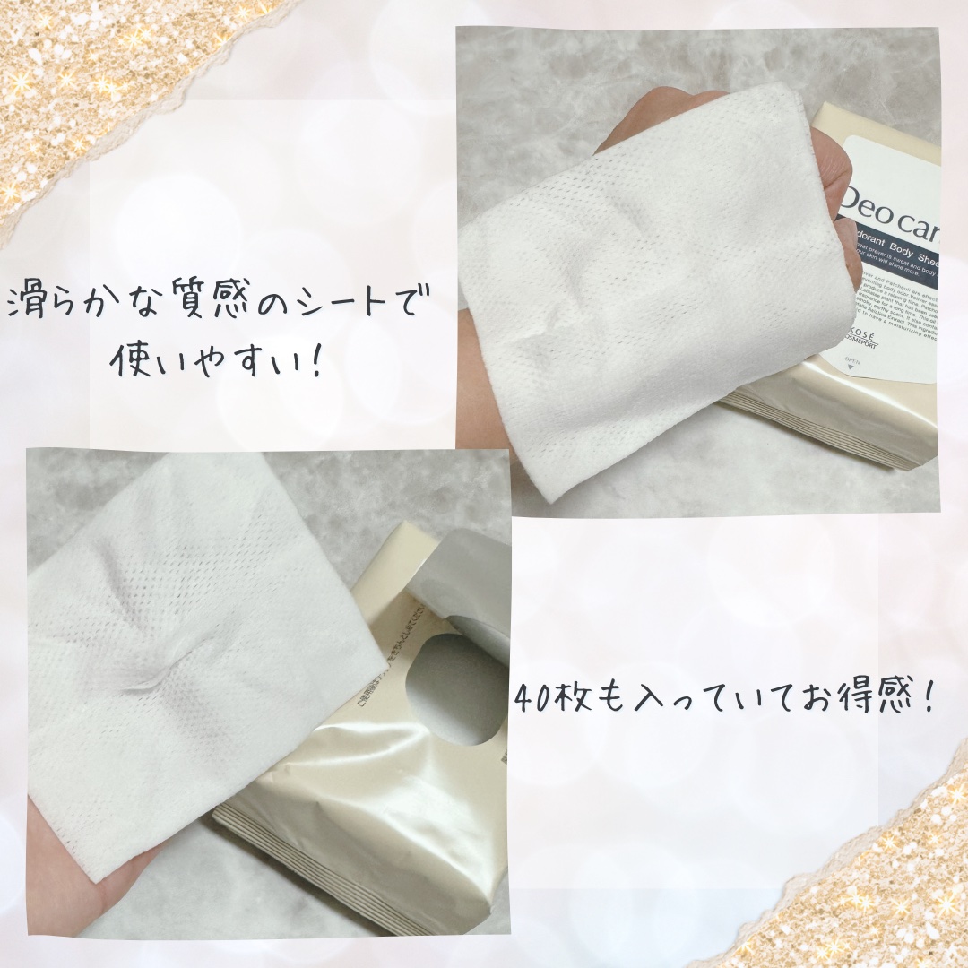 薬用デオドラント ボディシートは、40枚入のコスパの良さ。 少しミント感もありますが、キツくは無いし、香りも強すぎないので使いやすいです。 薬用デオドラント スプレーは、速乾&高密着タイプで、時間がたってもさらさら素肌が続くそうです。