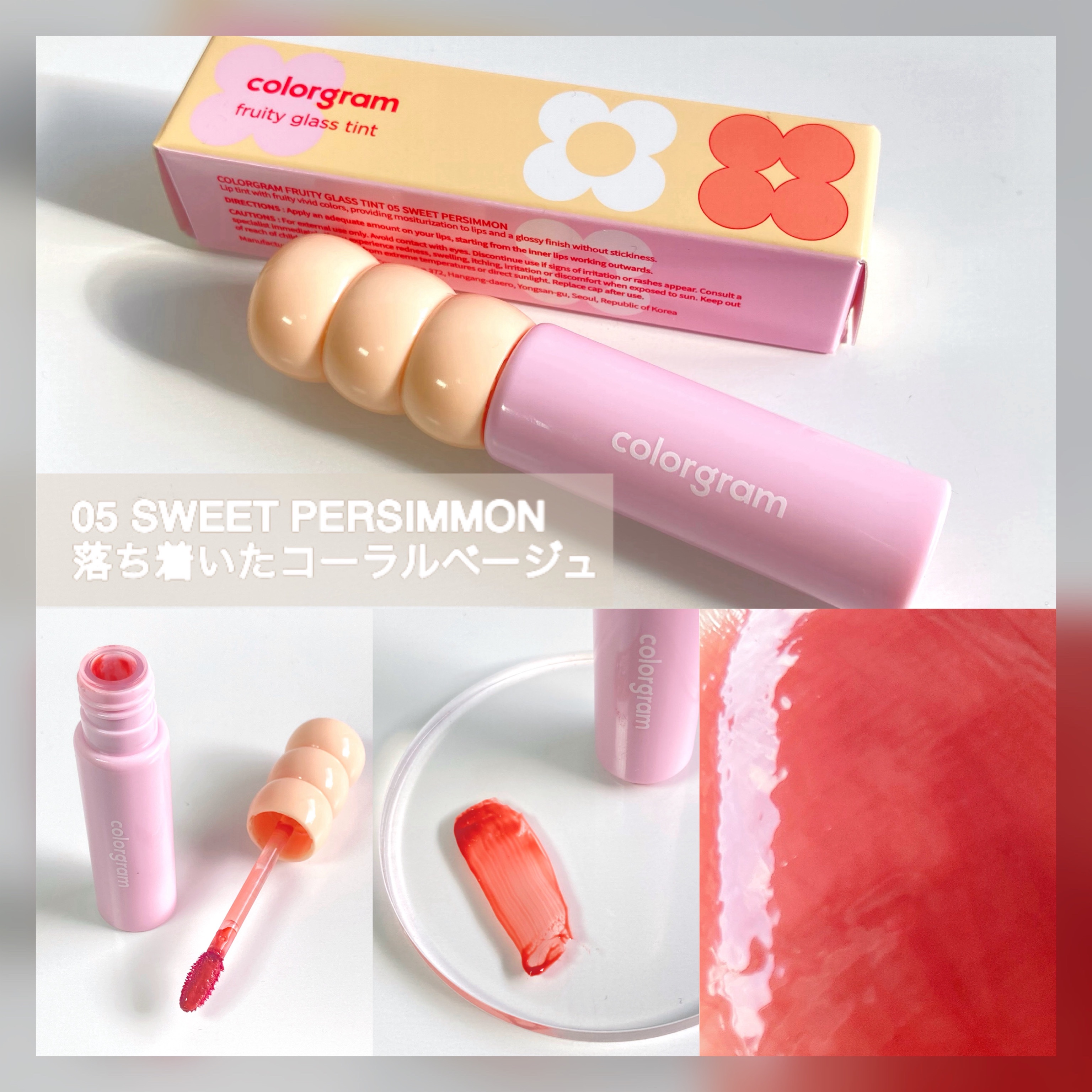 見た目もかわいい カラーグラムのティント🌼💗 うねうねころころした容器がかわいい💗 色もちも良くて、ティッシュオフしても長時間経っても発色もツヤ感もキープされててすごい✨ 05 スイートパーシモンは血色感のあるコーラルベージュカラー🍑 ブルベの私にも肌なじみが良く、顔色が明るくなる😌