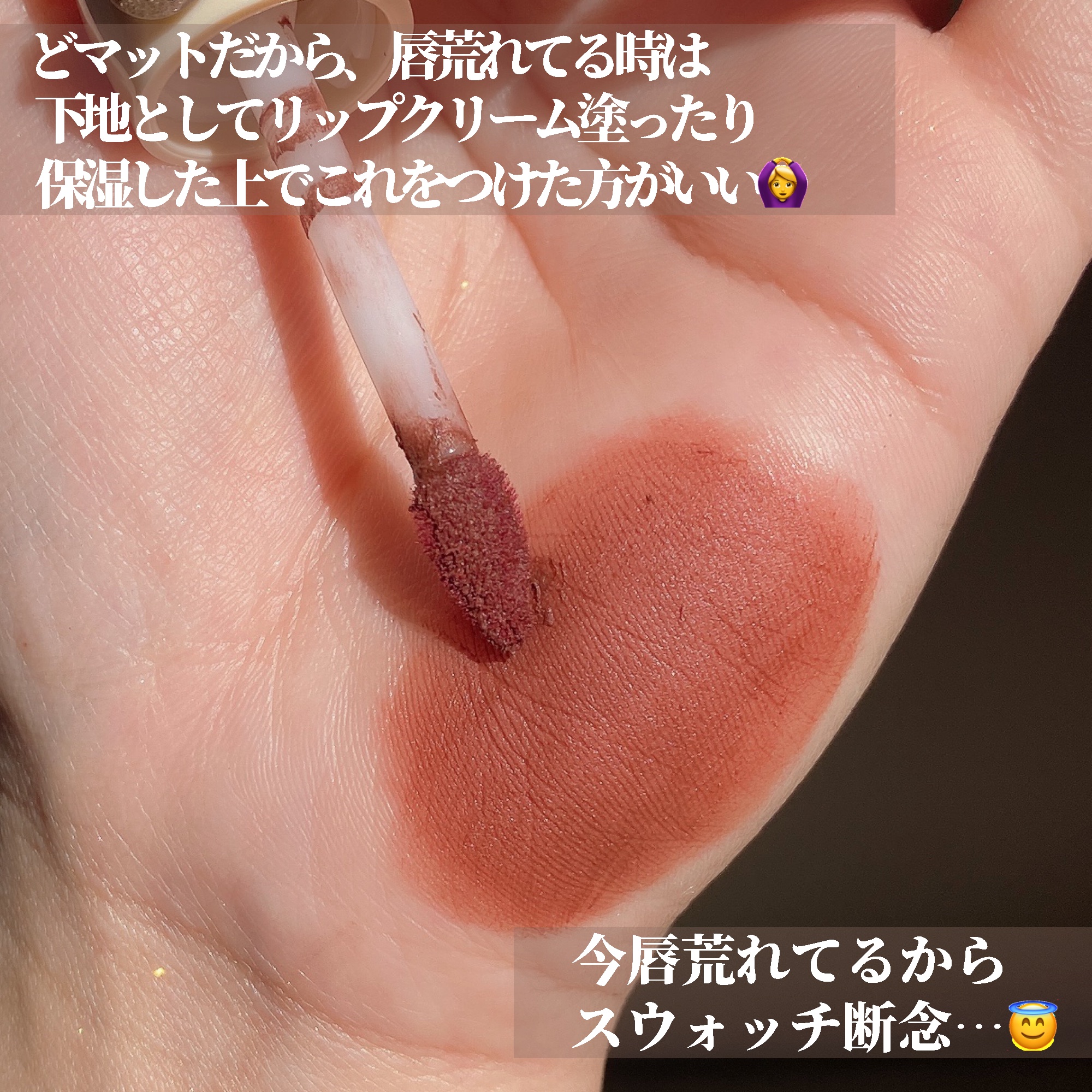 ふわっとベルベットなテクスチャーで、ムラになるか心配やったけど、んまんまするとすっと唇に馴染んでめっちゃ綺麗です☺️💓 このカラーもサイトの色より少し赤みも感じて血色悪くならずに使えるブラウンカラーでした✨ マットリップで落ちにくいしマスク下にもおすすめの一本です☺️💓 他にも気になるコスメがたくさんあるブランド🥺❤️