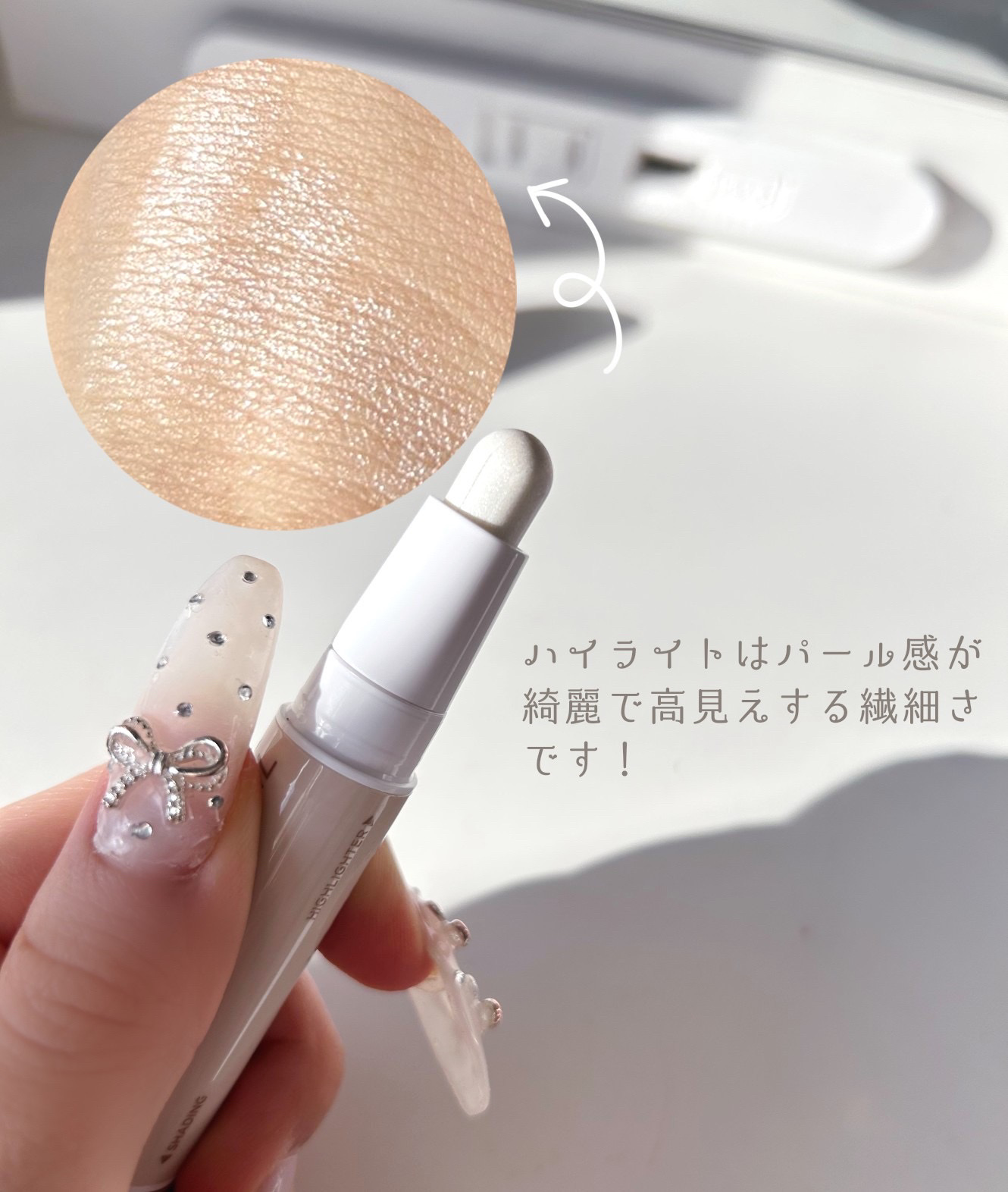- 狭く、小さく、ピンポイントに! 絶妙1.1cm幅のスティックタイプで欲しい陰影を狙い撃ち。 肌なじみがよく暗すぎないシェーディング&光すぎないハイライトが1本に。