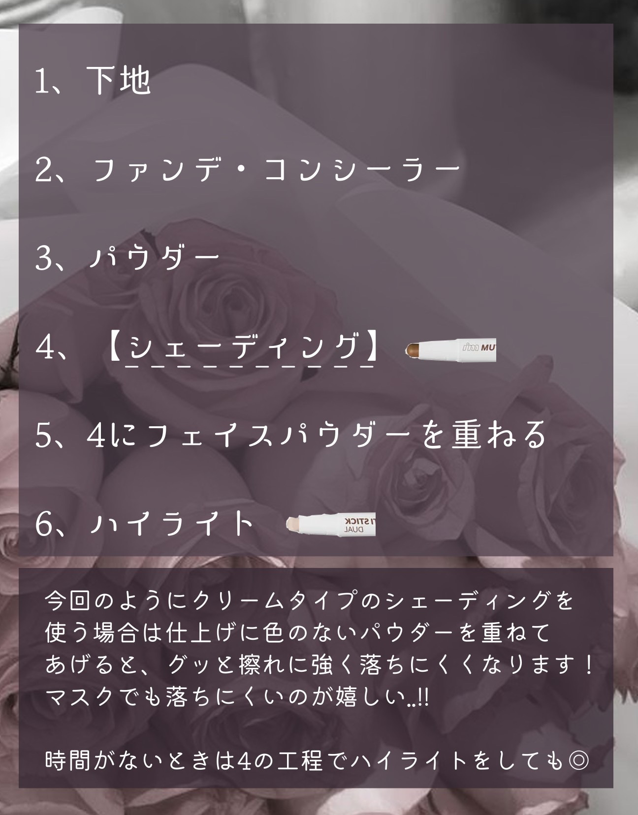 手早く済ませたい時はこのアイムミミのアイムマルチスティック デュアルを使っています♪ 指でなじませやすくて、想像以上に馴染む!! 001はイエベさん向き、002クールコントゥアリングはブルベさん向きのようですが、あまり違和感なく使えています♡ 2色使いすることで、ハッキリさせたい部分と自然に仕上げたい部分でまとまってる気がします♡