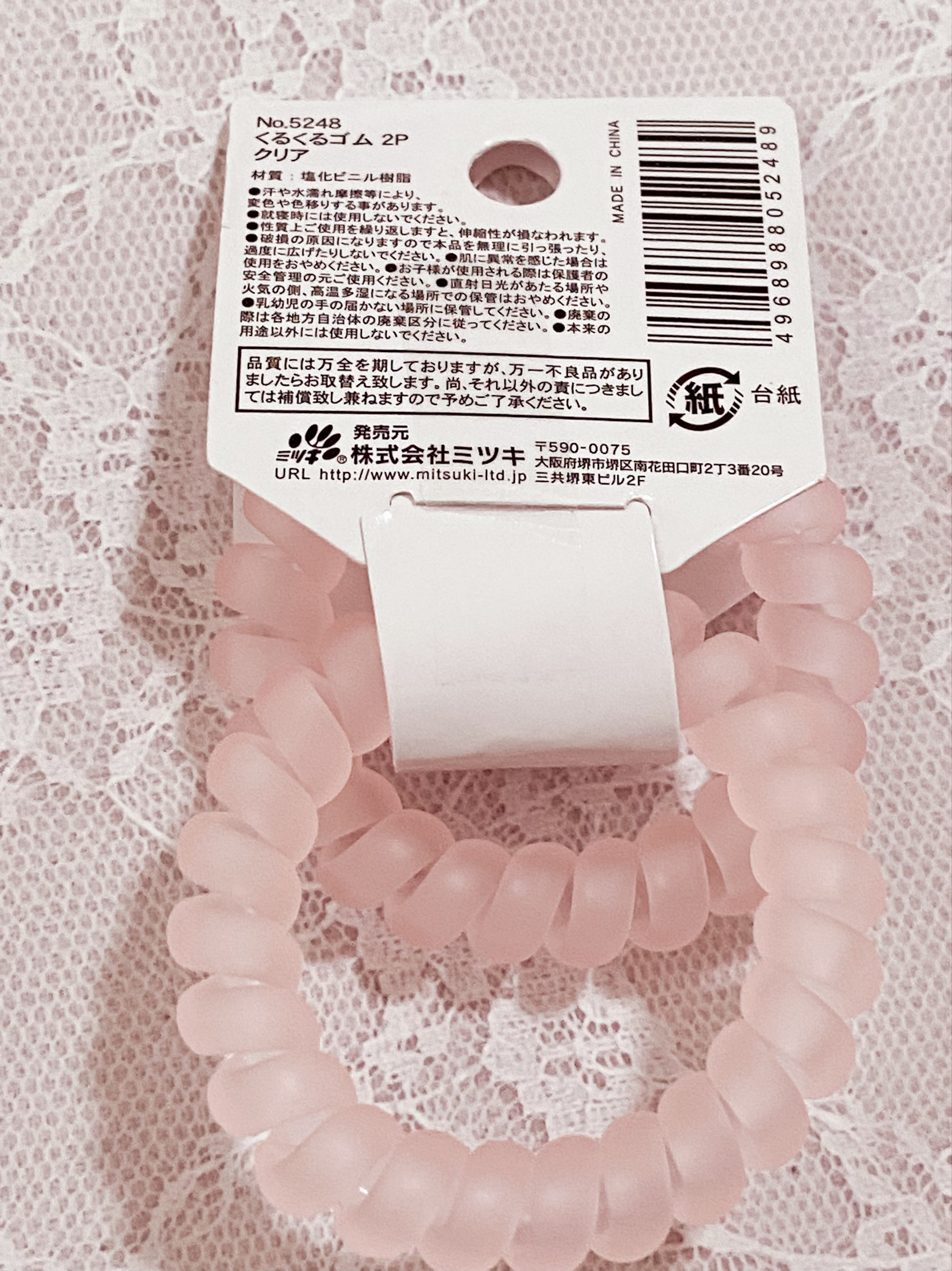 スプリング式のヘアゴム。髪に跡が付きにくく、水濡れOK。 実は直せます。熱で縮む特性があるのでお湯をぶっかけるかドライヤーの温風でほぼ元に戻ります。 「お気に入りだからまだもうちょっと使いたい!」とか「ちょっと100均行く暇がない!!」みたいな時には試してみてもいいかもしれませんね🙂