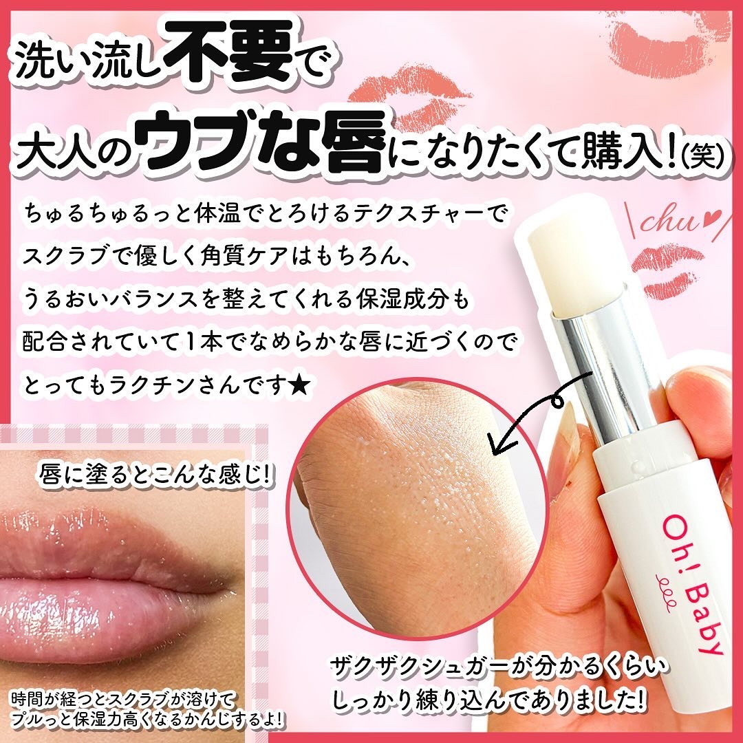 - ~つるつる、ぷるんのウブっぽ肌へ~“Oh!Baby” 待望のシリーズデビュー! ザラつき・ゴワつき・カサつきが気になる唇を、和三盆シュガースクラブ*でつるりなめらかに整えるリップクリーム。バームが体温でとろけて密着し、保湿パックとしてもお使いいただけます。 *グルコース・トウミツ・酒粕エキス(保湿成分) 【無色】無着色・無鉱物油・紫外線吸収剤無添加・タール系色素無添加・パラベンフリー アルコール(エタノール)フリー・石油系界面活性剤無添加