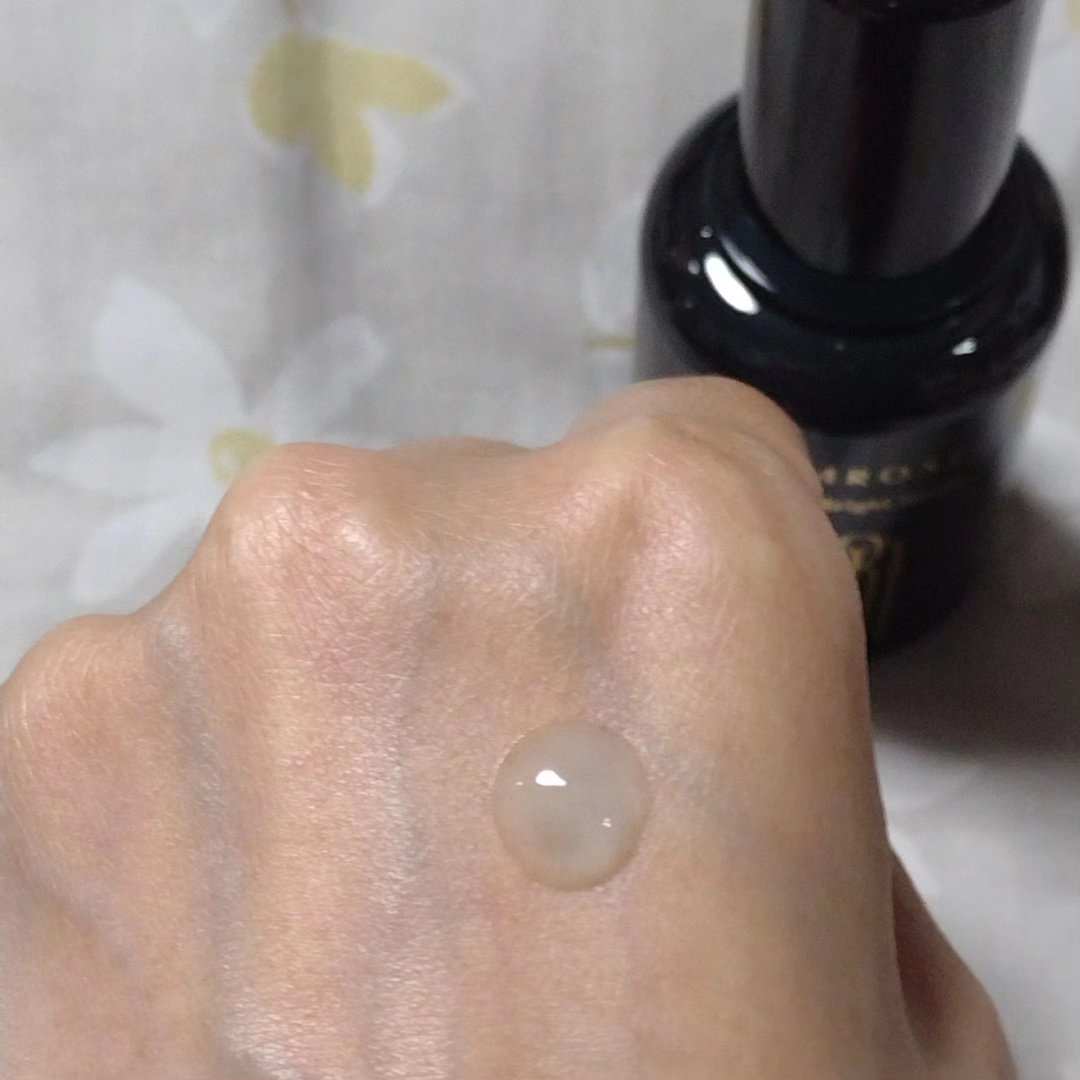とろっと濃密なテクスチャー。なめらかで濃いはちみつを塗っているような感じ。 しっかりぴたっと密着、濃密テクスチャーなのでやや重めな塗布感。 少量でとてもつやっとしっとりとした使い心地。 つけたときにすっーとした使い心地~ほの甘いバニラのような香りがふんわりしてお気に入りです。