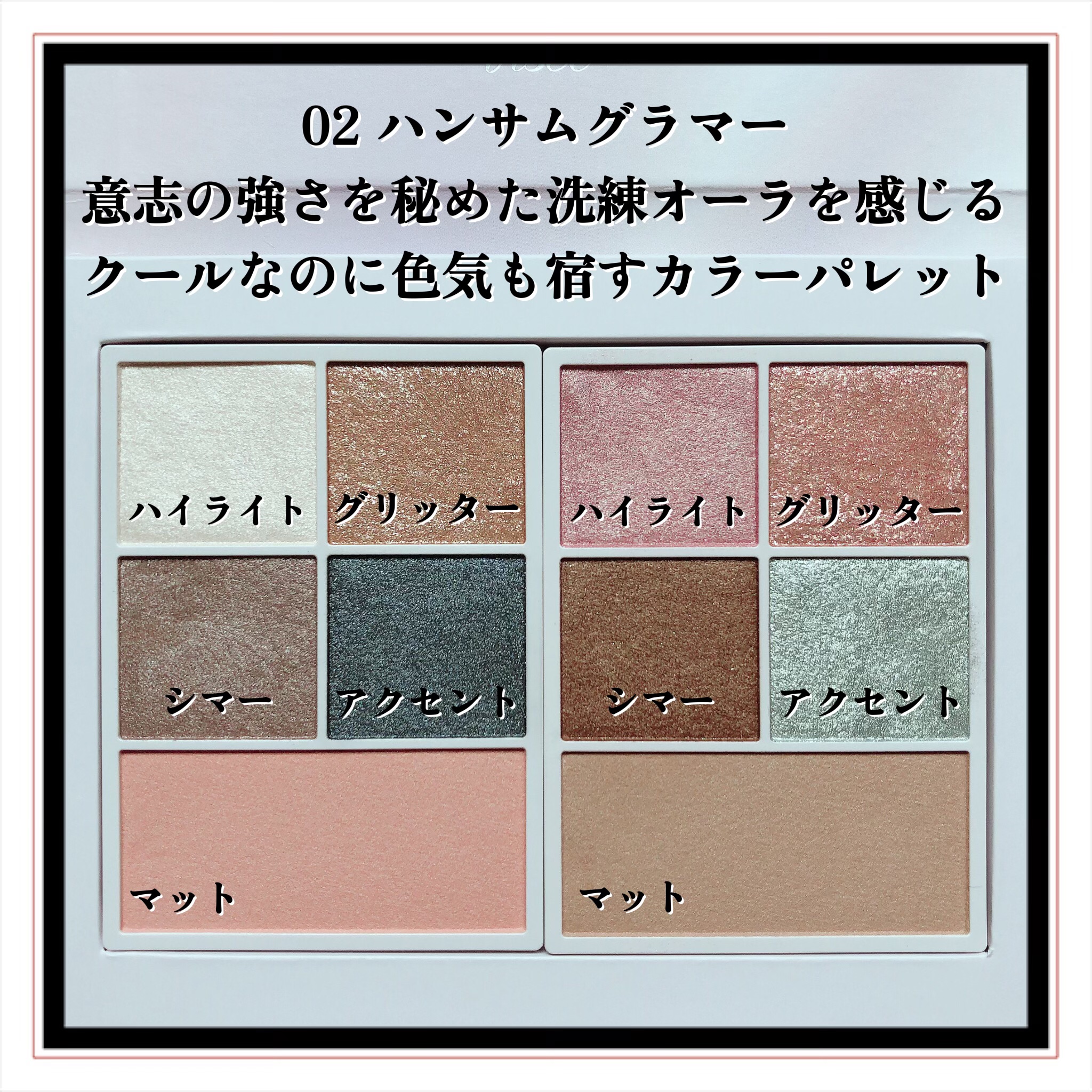 - <01 フェミニングラマー(限定)> タルク、ジメチコン、ステアロイルオキシステアリン酸オクチルドデシル、合成フルオロフロゴパイト、メタクリル酸メチルクロスポリマー、エチルヘキサン酸セチル、ステアリン酸オクチルドデシル、ホウケイ酸(Ca/Al)、リンゴ酸ジイソステアリル、ラウロイルグルタミン酸ジ(フィトステリル/オクチルドデシル)、ポリエチレン、水添ポリイソブテン、セスキイソステアリン酸ソルビタン、ミネラルオイル、トコフェロール、ヒアルロン酸Na、(ジメチコン/ビニルジメチコン)クロスポリマー、(ビニルジメチコン/ラウリルジメチコン)クロスポリマー、イソドデカン、オクチルドデカノール、シリカ、スクワラン、セスキステアリン酸ソルビタン、テトライソステアリン酸ポリグリセリル-2、トリエチルヘキサノイン、トリエトキシカプリリルシラン、ナイロン-12、ヘキサ(ヒドロキシステアリン酸/ステアリン酸/ロジン酸)ジペンタエリスリチル、酸化スズ、水酸化Al、クロルフェネシン、Al、グンジョウ、マイカ、酸化チタン、酸化亜鉛、酸化鉄、黄4、赤226 <02 ハンサムグラマー(限定)> タルク、ジメチコン、合成フルオロフロゴパイト、ステアロイルオキシステアリン酸オクチルドデシル、メタクリル酸メチルクロスポリマー、エチルヘキサン酸セチル、ステアリン酸オクチルドデシル、リンゴ酸ジイソステアリル、ポリエチレン、ラウロイルグルタミン酸ジ(フィトステリル/オクチルドデシル)、シリカ、水添ポリイソブテン、セスキイソステアリン酸ソルビタン、ミネラルオイル、トコフェロール、ヒアルロン酸Na、(ジメチコン/ビニルジメチコン)クロスポリマー、(ビニルジメチコン/ラウリルジメチコン)クロスポリマー、イソドデカン、オクチルドデカノール、スクワラン、セスキステアリン酸ソルビタン、テトライソステアリン酸ポリグリセリル-2、トリエチルヘキサノイン、トリエトキシカプリリルシラン、ナイロン-12、ヘキサ(ヒドロキシステアリン酸/ステアリン酸/ロジン酸)ジペンタエリスリチル、ホウケイ酸(Ca/Al)、酸化スズ、水酸化Al、クロルフェネシン、Al、グンジョウ、コンジョウ、マイカ、酸化チタン、酸化亜鉛、酸化鉄、黄4、赤226