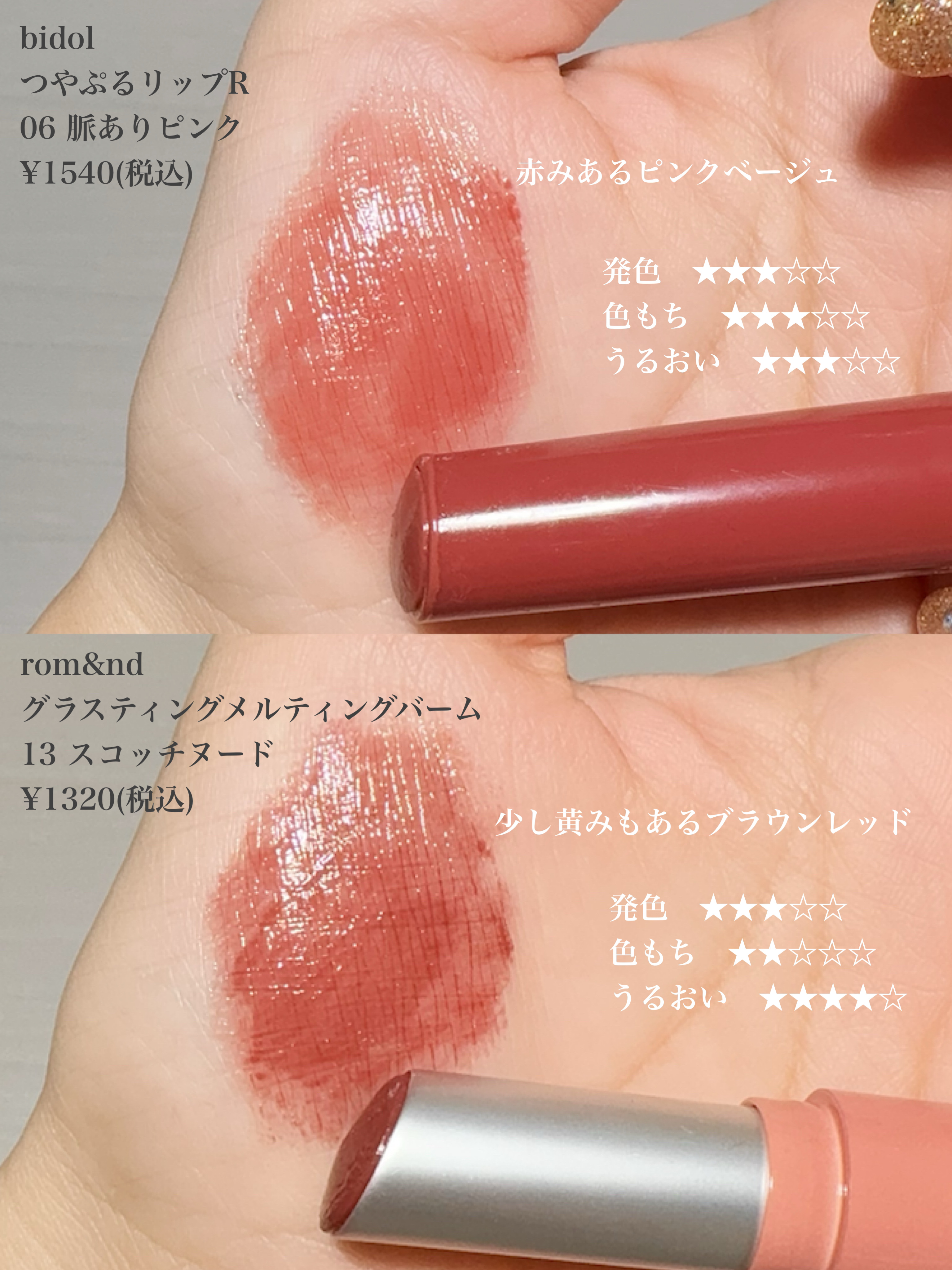 ロムアンドのリップは色展開も豊富で似てて絶妙に違う色が可愛くて集めたくなってしまいます。 リップスティックの方が塗りやすいので最近はリップスティックティントを買うようにしています。 ペリペラの薬果コラボは容器が可愛くていいです。