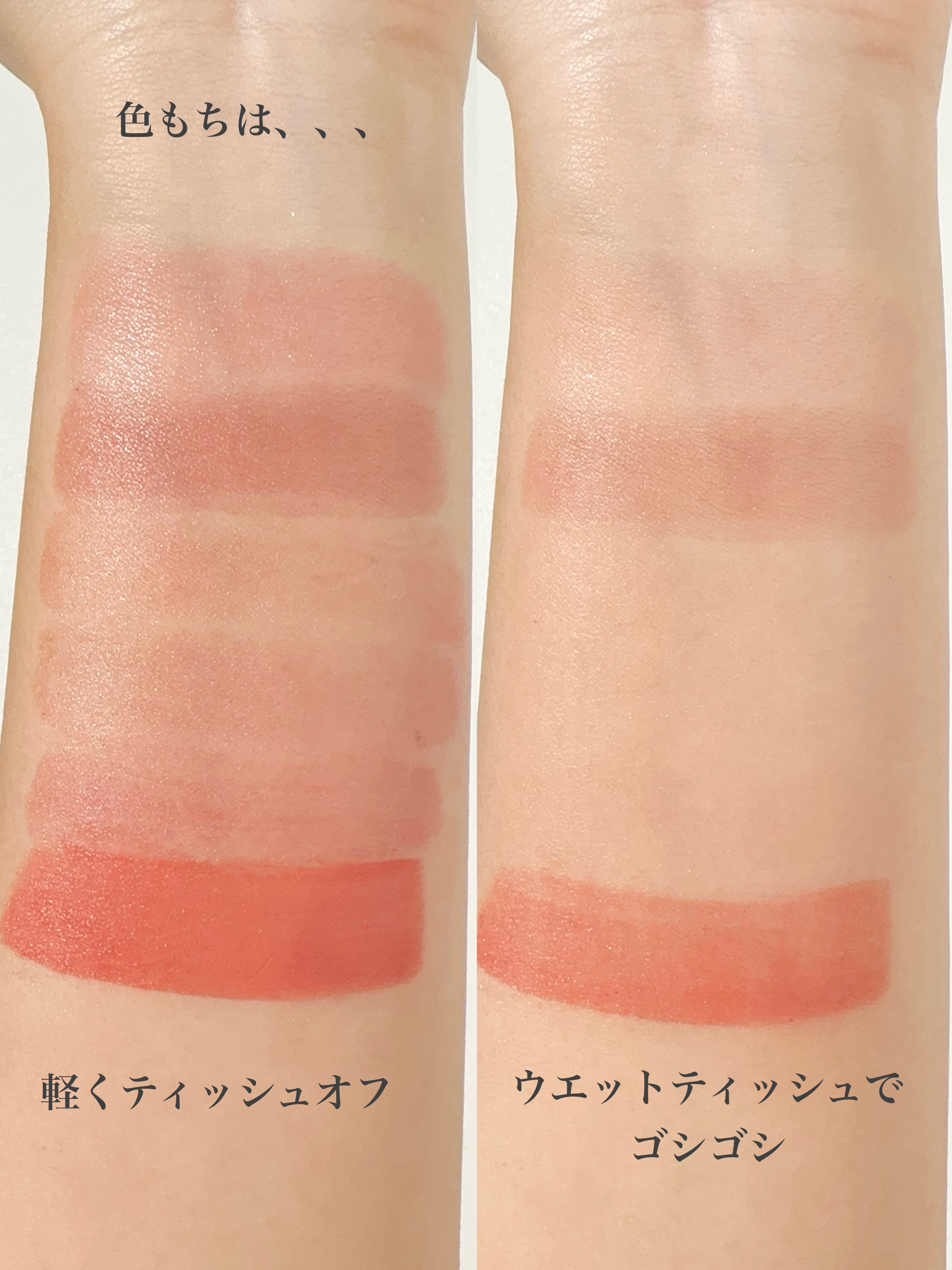 ねっちょりボリューム感あるテクスチャーだけど、ベタつきなく使いやすい。 ティントじゃない普通のグロスだから色もちは良くない。 発色ナチュラルだからこれだけでもいいけど、他のリップと合わせても可愛い!!