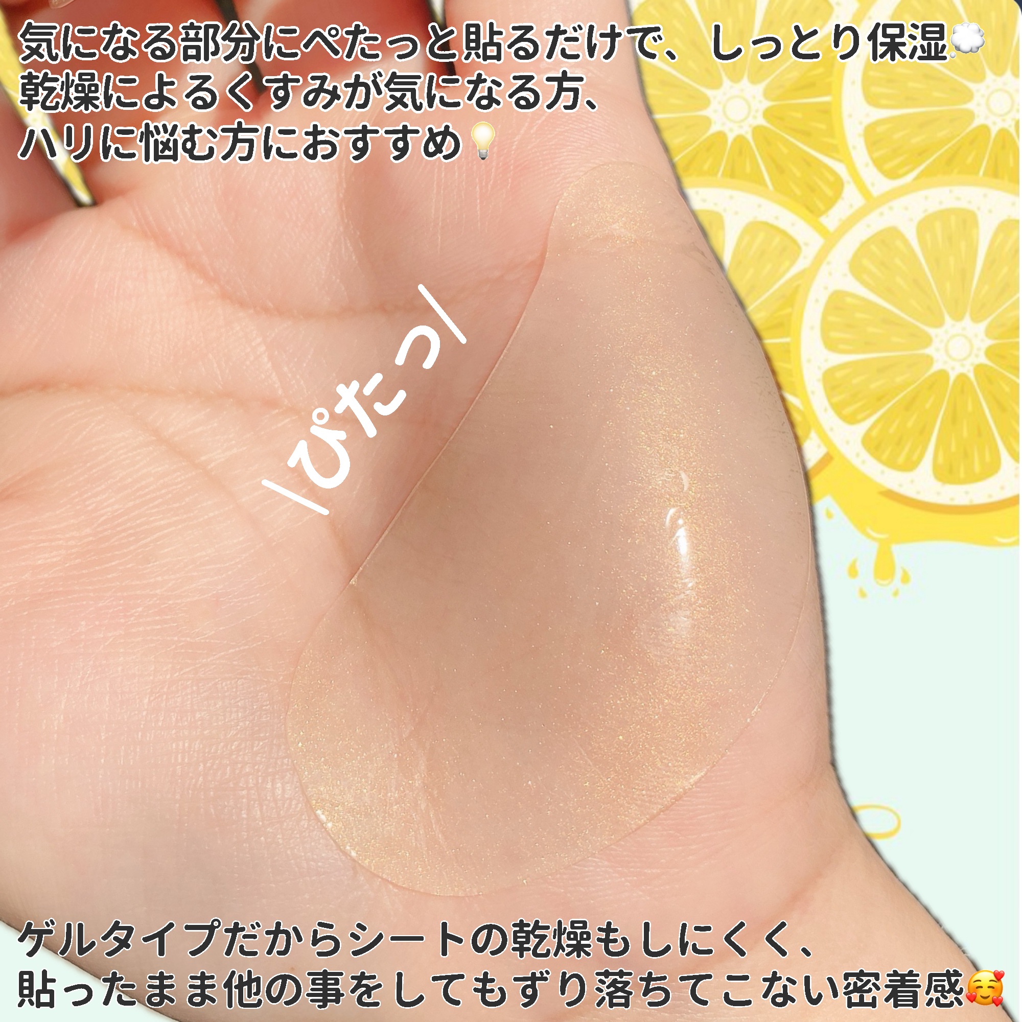 ビタコス ハイドロゲル アイパッチ 60枚入り ¥1,650(税込) ナイアシンアミド、ビタミンC誘導体*を配合したプルプルしたアイパッチ👀✨ 皮膚の温度に反応して美容成分が肌にぐんぐん浸透し徐々にゲルマスクが薄くなっていくよ🤩 一般の不織布より密着が良く長時間パックをしても肌が乾燥しにくいハイドロゲルタイプ✨ ピタッと密着してズレにくいから髪を乾かしながらパックするのもおすすめ♡ テトラへキシルデカン酸アスコルビル