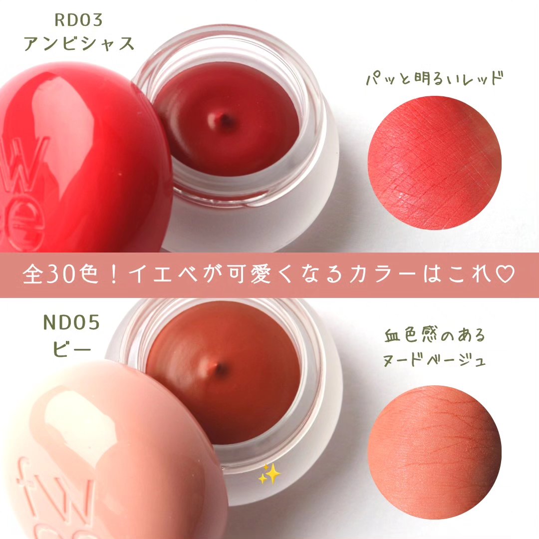 コロンとした丸みのある可愛らしいデザイン。ふんわりとしたムースプリンのようなクリーム質感のリップアンドチーク。肌に馴染ませるとサラッとしているマットな使用感です。 ND01 OH!は、くすみ感のないフレッシュな青みピンクカラー。好みの濃さに、またパウダーチークと重ねることも出来るのでイエベでも可愛らしい青みピンクカラーに挑戦しやすかったです。 値段も手頃で色展開も豊富なので、コーラル系やピーチ系のカラーも集めたくなりました。
