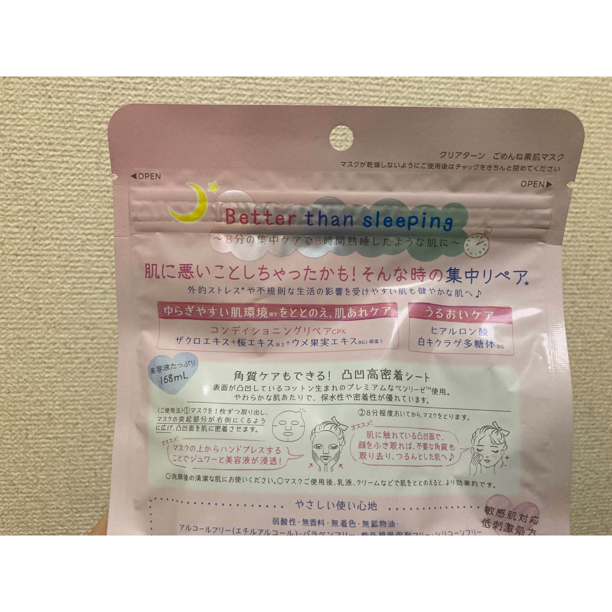 - 【クリアターン ごめんね素肌マスク】 負担をかけて、あれてしまった肌の素肌環境※1をととのえる“速攻集中リペア※2マスク”です。 ① あれがちな肌を素早くコンディションケア! ザクロエキス、桜エキス※3、ウメ果実エキスBG配合し、ゆらぎやすい肌環境をととのえ、肌あれをケアします。また、うるおいケア成分として、ヒアルロン酸、白キクラゲ多糖体BGを配合。外的ストレス※4や不規則な生活の影響を受けやすい肌も健やかでゆらぎにくい肌へみちびきます。 ②敏感肌も使える、弱酸性・低刺激処方 無香料・無着色・無鉱物油・アルコールフリー(エチルアルコール)・パラベンフリー・紫外線吸収剤フリー・シリコーンフリー・パッチテスト済み・アレルギーテスト済み・スティンギングテスト済み・敏感肌自覚者による連用テスト済み(すべての方にアレルギーや皮膚刺激が起きない、刺激感がないというわけではありません。すべての方の肌に合うということではありません。) ③角質ケアもできる!凸凹高密着シート コットン生まれのやわらかな肌触りのベンリーゼを使用。 表面に凸凹のエンボス加工を施しているため、密着性が高く、はがしたマスクでやさしく顔をふきとることで角質ケアもできます。 ※1 うるおい環境のこと ※2 うるおいお手入れのこと ※3 ソメイヨシノ葉エキス、ウメ果実エキスBGはウメ果実エキス・BG(保湿) ※4 乾燥による刺激のこと