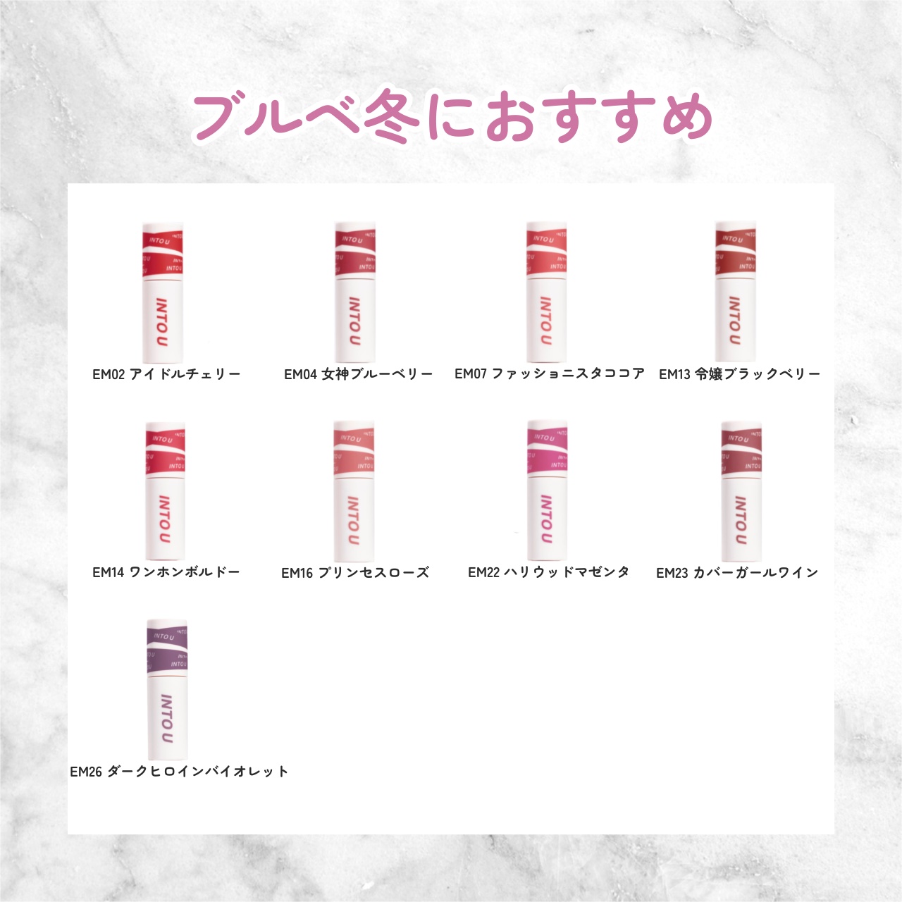 \INTOUスーパーマットリップ&チークマッド/EM01 ポップスターブリックEM02 アイドルチェリーEM03モデルテラコッタEM06 人気者オレンジEM12高嶺の花コーラルEM13 令嬢ブラックベリーEM14 ワンホンボルドーEM15 初...