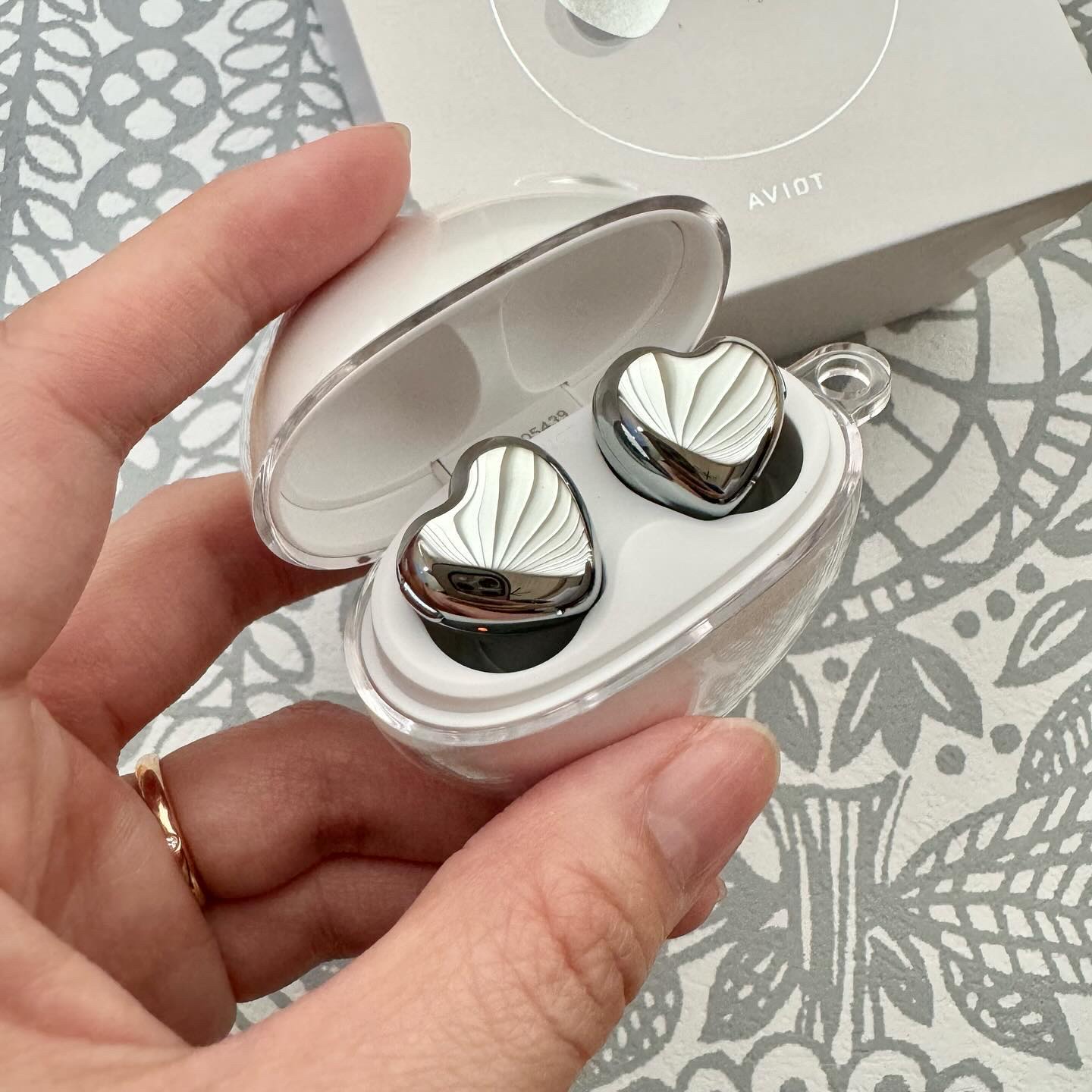 可愛いハート♡モチーフの可愛いワイヤレスイヤホン!! 全3色展開でゴールドを使用✨ 表面のメタリック塗装には指紋がつきにくいように UV加工しているのがお気に入りポイント!! イヤーピースがXS/S/M/Lの4サイズ展開。素材は医療用シリコン採用しているそう。 フィット感が良く、遮音性が優れていると感じました!! 角のない丸いケースを含めても軽く、小さくて持ち運びしやすいです◎ケース本体はセミマット加工、汚れや傷がつかないように透明の専用ケース付きな所も◎ カバンなどに取り付けられるハート型のカラビナも可愛い♡