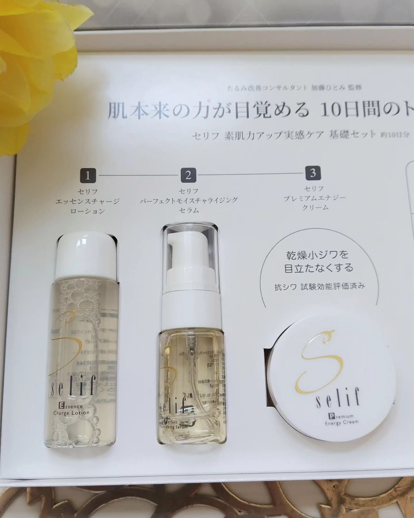 セリフは合成界面活性剤完全無添加・合成ポリマー、パラベン完全無添加で、敏感肌や乾燥肌でお悩みの方も使え、リピート率も高い化粧品だそうです。 ⚪︎エッセンスチャージローション さらっとしたみずみずしいテクスチャーの化粧水。 ⚪︎パーフェクトモイスチャライジングセラム ややとろみのあるテクスチャーで、みずみずしくて、肌なじみが良いです。 ⚪︎プレミアムエナジークリーム 高保湿なクリームで、なめらかな使用感が保湿効果を期待出来そうです。 セラムとクリームを混ぜて使うのも、時短になるし肌なじみが良かったです。 3ステップで、10日間じっくり試せるのも嬉しいです。