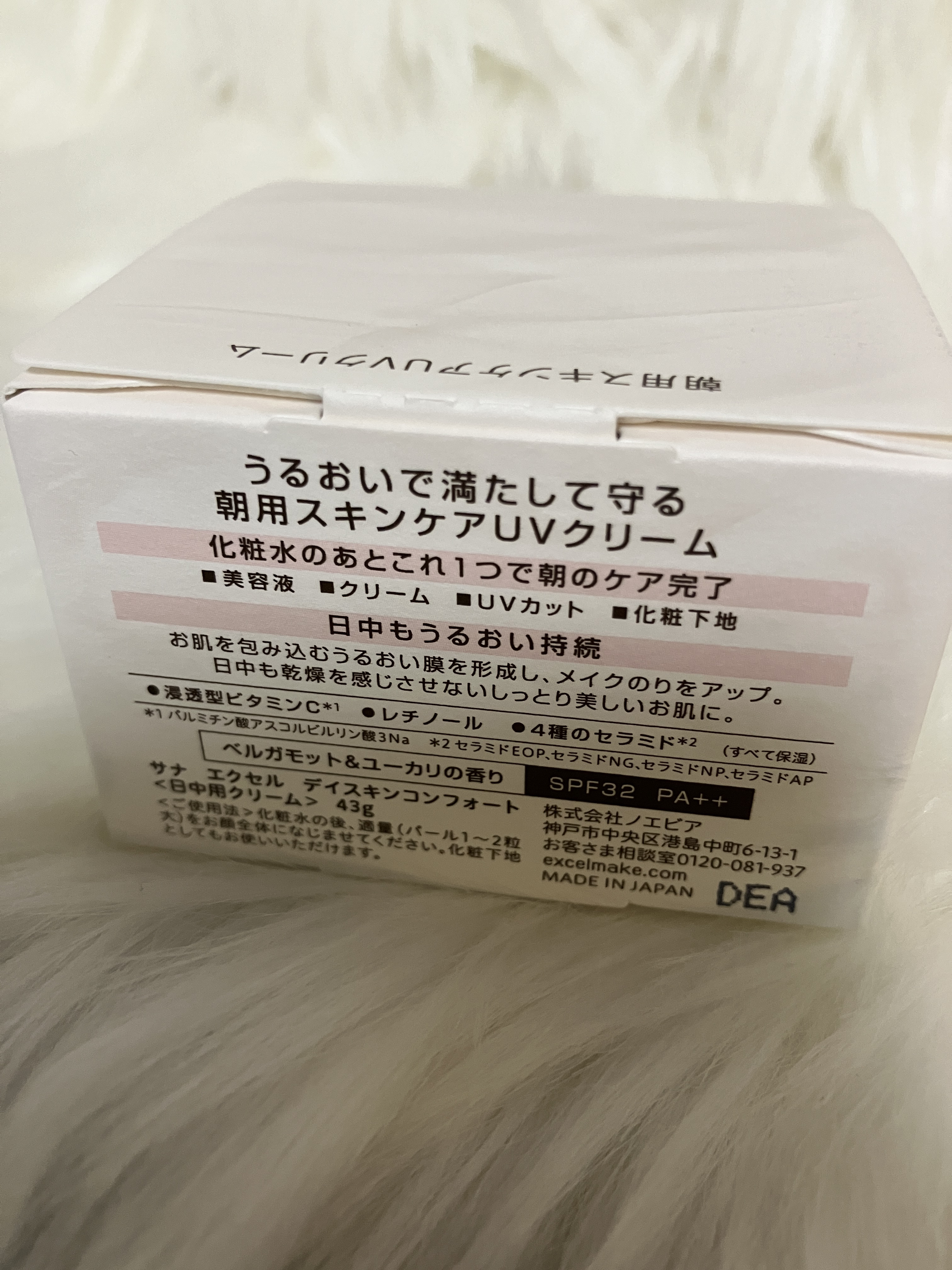 - うるおいで満たして守る朝用スキンケアUVクリーム 化粧水のあとこれ1つで朝のケア完了 ■美容液 ■クリーム ■UVカット ■化粧下地 日中もうるおい持続 うるおい膜でお肌を包み込み、メイクのりをアップ。 日中も乾燥を感じにくいしっとり美しいお肌に。 ●浸透*1型ビタミンC*2 ●レチノール ●4種のセラミド*3(すべて保湿) SPF32 PA++ 日中用クリーム 1日の始まりにやわらぐベルガモット&ユーカリの香り お好みの下地を重ねてもOK *1角質層まで *2パルミチン酸アスコルビルリン酸3Na *3セラミドEOP、セラミドNG、セラミドNP、セラミドAP 【エクセル ’24 ベースアイテムセット DC】 ◇お肌に異常が生じていないかよく注意して使用してください。 ◇傷・はれもの・しっしん等異常のあるときは、お使いにならないでください。 ◇使用中、または使用後日光にあたって、赤味・はれ・かゆみ・刺激・色抜け(白斑等)や黒ずみ等の異常があらわれたときは、使用を中止し、皮フ科専門医等にご相談されることをおすすめします。そのまま化粧品類の使用を続けますと悪化することがあります。 ◇極端な高温や低温、直射日光を避け、乳幼児の手の届かないところに保管してください。 サナ エクセル デイスキンコンフォート ◇使用後はしっかりフタを閉めてください。 ◇衣服についた場合、塩素系漂白剤の使用は避けてください。 サナ エクセル フェザライズオン パウダー ◇落としたり、強い衝撃を与えたりすると中身が割れることがありますのでご注意ください。