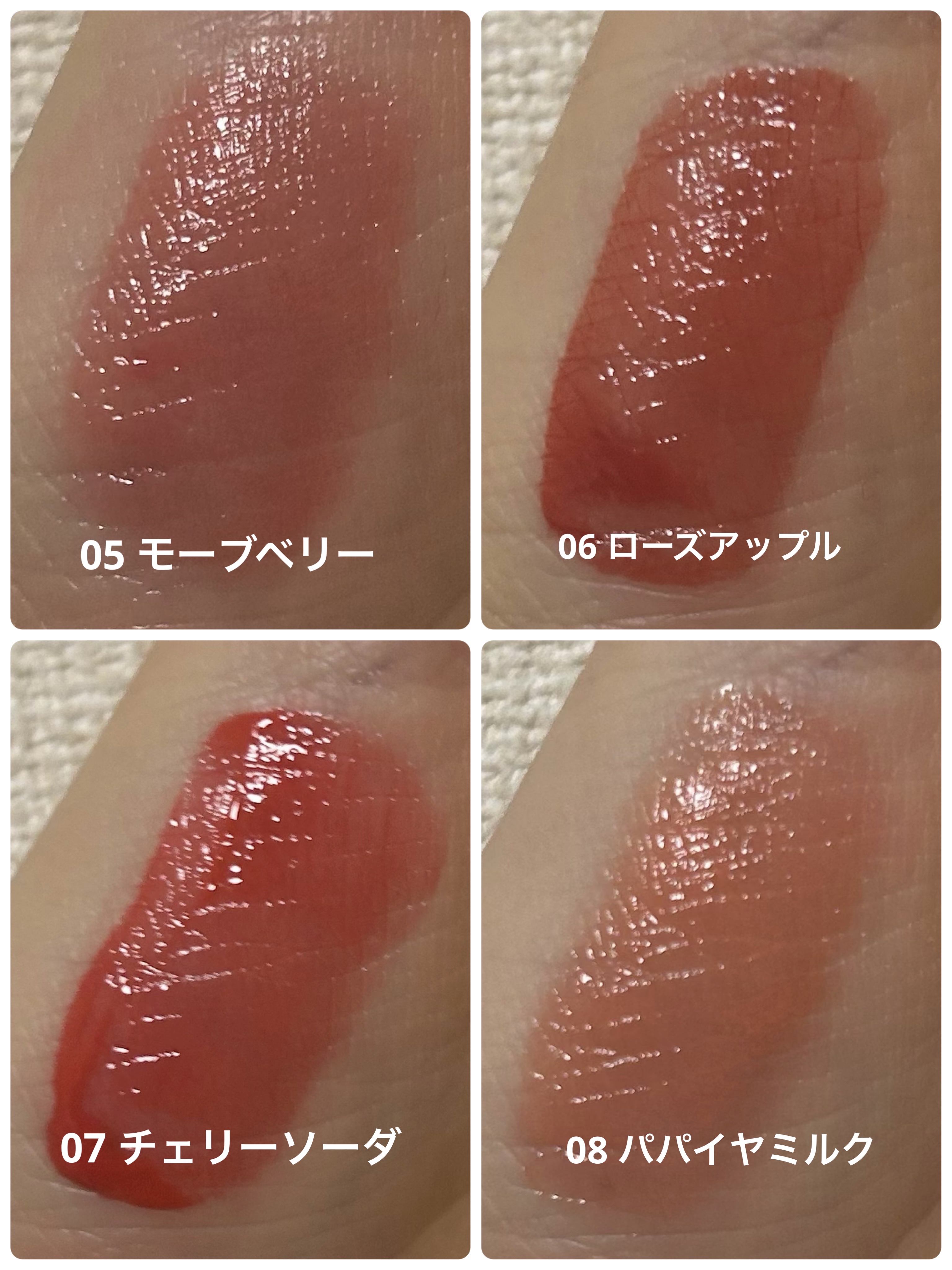 - <01 ムードマンゴー> 水、ジフェニルジメチコン、リンゴ酸ジイソステアリル、ビスジグリセリルポリアシルアジペート-2、ジグリセリン、水添ポリイソブテン、ダイマージリノール酸(フィトステリル/イソステアリル/セチル/ステアリル/ベヘニル)、ポリソルベート60、セチルPEG/PPG-10/1ジメチコン、DPG、ポリフェニルシルセスキオキサン、イソステアリン酸ソルビタン、ダイマージリノール酸ジイソステアリン酸ポリグリセリル-3、1,2-ヘキサンジオール、オクチルドデカノール、トリ(カプリル酸/カプリン酸)グリセリル、(アクリル酸ヒドロキシエチル/アクリロイルジメチルタウリンNa)コポリマー、セテアリルアルコール、酸化チタン、スクワラン、フェノキシエタノール、赤102、安息香酸ベンジル、エチルヘキシルグリセリン、黄4、香料、赤104(1)、水酸化Al、黄5、ポリアクリル酸アンモニウム、リナロール、BG、青1、塩化Na、ヘキシルシンナマル、トコフェロール <02 メロンシャーベット> 水、ジフェニルジメチコン、リンゴ酸ジイソステアリル、ビスジグリセリルポリアシルアジペート-2、ジグリセリン、水添ポリイソブテン、ダイマージリノール酸(フィトステリル/イソステアリル/セチル/ステアリル/ベヘニル)、ポリソルベート60、セチルPEG/PPG-10/1ジメチコン、DPG、ポリフェニルシルセスキオキサン、イソステアリン酸ソルビタン、ダイマージリノール酸ジイソステアリン酸ポリグリセリル-3、1,2-ヘキサンジオール、オクチルドデカノール、トリ(カプリル酸/カプリン酸)グリセリル、酸化チタン、(アクリル酸ヒドロキシエチル/アクリロイルジメチルタウリンNa)コポリマー、セテアリルアルコール、スクワラン、フェノキシエタノール、赤102、黄4、安息香酸ベンジル、エチルヘキシルグリセリン、赤104(1)、香料、水酸化Al、ポリアクリル酸アンモニウム、赤227、リナロール、BG、塩化Na、ヘキシルシンナマル、トコフェロール <03 ピンクグアバ> 水、ジフェニルジメチコン、リンゴ酸ジイソステアリル、ビスジグリセリルポリアシルアジペート-2、ジグリセリン、水添ポリイソブテン、ダイマージリノール酸(フィトステリル/イソステアリル/セチル/ステアリル/ベヘニル)、ポリソルベート60、セチルPEG/PPG-10/1ジメチコン、DPG、ポリフェニルシルセスキオキサン、イソステアリン酸ソルビタン、ダイマージリノール酸ジイソステアリン酸ポリグリセリル-3、1,2-ヘキサンジオール、オクチルドデカノール、トリ(カプリル酸/カプリン酸)グリセリル、(アクリル酸ヒドロキシエチル/アクリロイルジメチルタウリンNa)コポリマー、セテアリルアルコール、スクワラン、フェノキシエタノール、酸化チタン、赤104(1)、安息香酸ベンジル、エチルヘキシルグリセリン、黄5、香料、水酸化Al、ポリアクリル酸アンモニウム、リナロール、赤227、BG、青1、ヘキシルシンナマル、トコフェロール <04 プラムデュー> 水、ジフェニルジメチコン、リンゴ酸ジイソステアリル、ビスジグリセリルポリアシルアジペート-2、ジグリセリン、水添ポリイソブテン、ダイマージリノール酸(フィトステリル/イソステアリル/セチル/ステアリル/ベヘニル)、ポリソルベート60、セチルPEG/PPG-10/1ジメチコン、DPG、ポリフェニルシルセスキオキサン、イソステアリン酸ソルビタン、ダイマージリノール酸ジイソステアリン酸ポリグリセリル-3、1,2-ヘキサンジオール、オクチルドデカノール、トリ(カプリル酸/カプリン酸)グリセリル、(アクリル酸ヒドロキシエチル/アクリロイルジメチルタウリンNa)コポリマー、セテアリルアルコール、酸化チタン、スクワラン、フェノキシエタノール、赤104(1)、黄5、赤227、安息香酸ベンジル、エチルヘキシルグリセリン、香料、黄4、水酸化Al、ポリアクリル酸アンモニウム、リナロール、BG、ヘキシルシンナマル、塩化Na、トコフェロール <05 モーブベリー> 水、ジフェニルジメチコン、リンゴ酸ジイソステアリル、ビスジグリセリルポリアシルアジペート-2、ジグリセリン、水添ポリイソブテン、ダイマージリノール酸(フィトステリル/イソステアリル/セチル/ステアリル/ベヘニル)、ポリソルベート60、セチルPEG/PPG-10/1ジメチコン、DPG、ポリフェニルシルセスキオキサン、イソステアリン酸ソルビタン、ダイマージリノール酸ジイソステアリン酸ポリグリセリル-3、1,2-ヘキサンジオール、オクチルドデカノール、トリ(カプリル酸/カプリン酸)グリセリル、(アクリル酸ヒドロキシエチル/アクリロイルジメチルタウリンNa)コポリマー、セテアリルアルコール、酸化チタン、スクワラン、フェノキシエタノール、赤227、黄5、安息香酸ベンジル、エチルヘキシルグリセリン、香料、水酸化Al、ポリアクリル酸アンモニウム、リナロール、黄4、BG、ヘキシルシンナマル、塩化Na、トコフェロール <06 ローズアップル> 水、ジフェニルジメチコン、リンゴ酸ジイソステアリル、ビスジグリセリルポリアシルアジペート-2、ジグリセリン、水添ポリイソブテン、ダイマージリノー