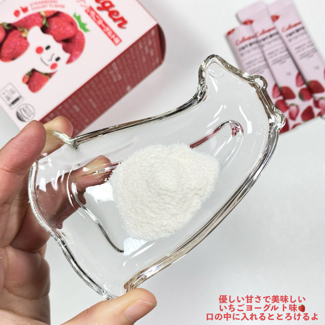 吸収率が高い超低分子フィッシュコラーゲンなんと195da! Lシステイン、ビタミンCまで配合🍋 この1包でぷるぷるなお肌に導いてくれるんだとか! 私が選んだのはイチゴヨーグルト味🍓 甘酸っぱくて粉っぽさもなく 水なしでそのまま飲んでも美味しいし ヨーグルトやアイスにかけても◎ フレーバーも6種類あって 抹茶ラテ味、イチゴヨーグルト味、桃ヨーグルト味、シャインマスカット味、ソルティキャラメル味、ヨーグルト味と豊富✨