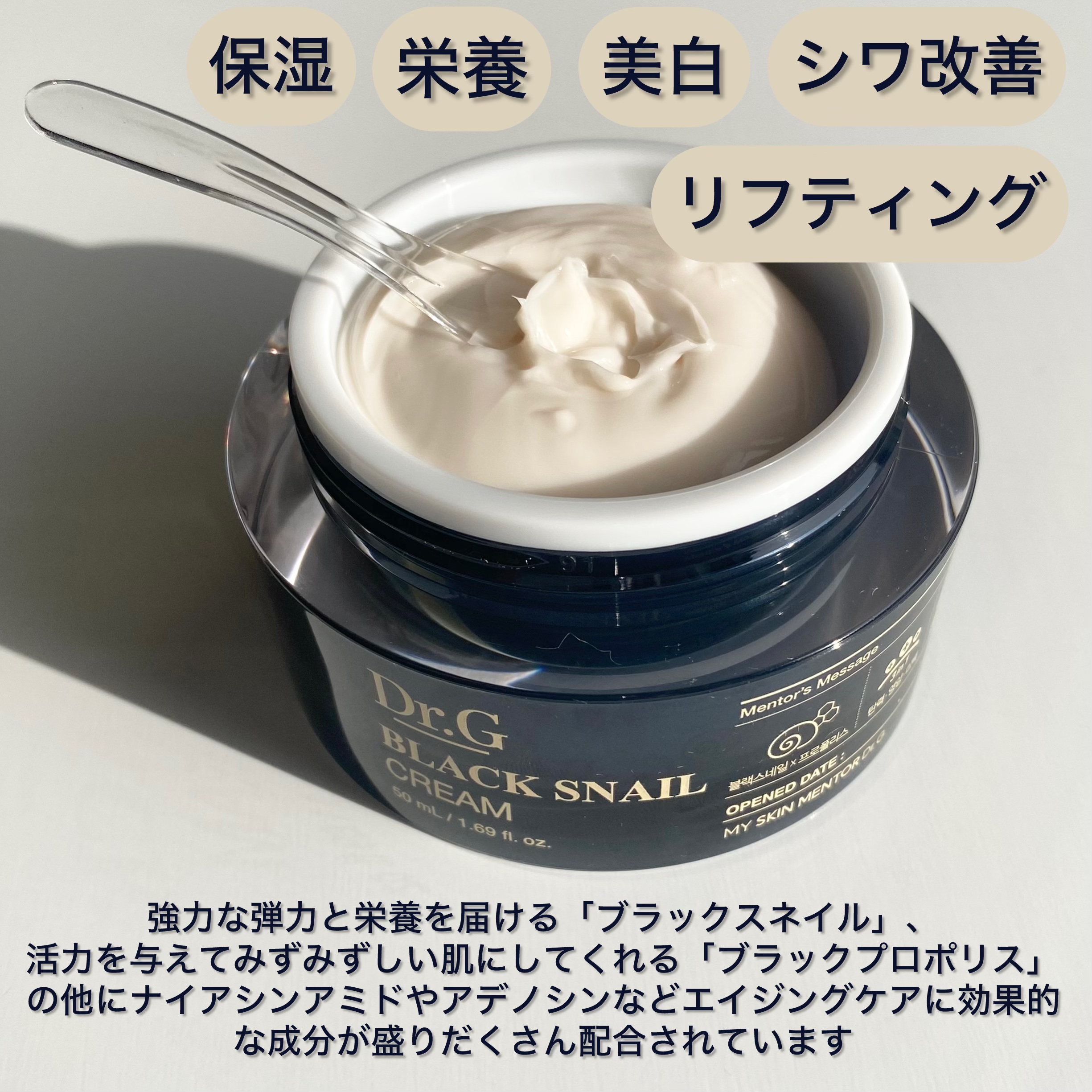 - 保湿だけでなく、透明感*1、ハリ、弾力のケアまでできる、クリームです。 ブラックスネイル*2を20%配合し、さらにブラックプロポリス*2を配合しているので、エイジングケア*3に必要な潤いをしっかりと肌に与え、もっちりと潤ったお肌に導きます。ナイアシンアミド*2やツボクサエキス*2なども含まれているので、様々な保湿ケアに対応できるため、肌の健やかさを保つことができます。 *1艶やかな肌印象のこと *2整肌成分 *3年齢に応じたお手入れ