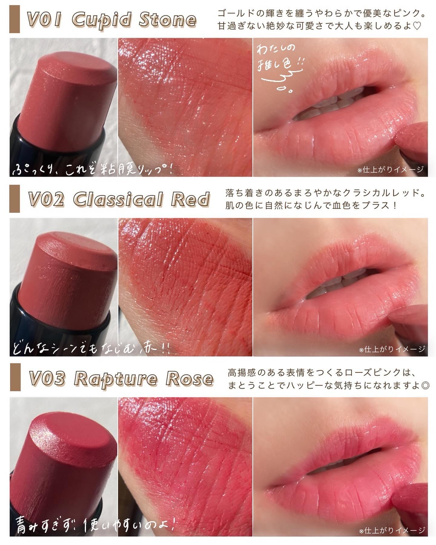 - <EX3 Cranberry Drop> 水添ポリイソブテン、ラウロイルグルタミン酸ジ(フィトステリル/オクチルドデシル)、トリ(カプリル酸/カプリン酸)グリセリル、ラウロイルグルタミン酸ジ(オクチルドデシル/フィトステリル/ベヘニル)、イソノナン酸イソトリデシル、ダイマージリノール酸(フィトステリル/イソステアリル/セチル/ステアリル/ベヘニル)、パラフィン、ポリエチレン、オクチルドデカノール、マイクロクリスタリンワックス、水添マイクロクリスタリンワックス、パルミトイルヒドロキシプロピルセルロース、ヒドロキシステアリン酸エチルヘキシル、トコフェロール、トリポリヒドロキシステアリン酸ジペンタエリスリチル、デカイソステアリン酸ポリグリセリル- 10、マカデミア種子油、マカデミアナッツ脂肪酸フィトステリル、アンズ核油、カニナバラ果実油、(エチレン/プロピレン)コポリマー、ジメチコン、ダイズ油、クエン酸、ニンジン根エキス、(+/-)(チタン/酸化チタン)焼結物、グンジョウ、セルロース、パルミチン酸、マイカ、ラウロイルアスパラギン酸Na、ラウロイルリシン、塩化亜鉛、酸化チタン、酸化鉄、水酸化Al、硫酸Ba、トリイソステアリン酸イソプロピルチタン、合成フルオロフロゴパイト、黄4、赤104(1)、赤201、赤202、赤223 <EX4 Guava Punch> 水添ポリイソブテン、ラウロイルグルタミン酸ジ(フィトステリル/オクチルドデシル)、トリ(カプリル酸/カプリン酸)グリセリル、ラウロイルグルタミン酸ジ(オクチルドデシル/フィトステリル/ベヘニル)、イソノナン酸イソトリデシル、ダイマージリノール酸(フィトステリル/イソステアリル/セチル/ステアリル/ベヘニル)、パラフィン、ポリエチレン、オクチルドデカノール、マイクロクリスタリンワックス、水添マイクロクリスタリンワックス、パルミトイルヒドロキシプロピルセルロース、ヒドロキシステアリン酸エチルヘキシル、トコフェロール、トリポリヒドロキシステアリン酸ジペンタエリスリチル、デカイソステアリン酸ポリグリセリル- 10、マカデミア種子油、マカデミアナッツ脂肪酸フィトステリル、アンズ核油、カニナバラ果実油、(エチレン/プロピレン)コポリマー、ジメチコン、ダイズ油、クエン酸、ニンジン根エキス、(+/-)(チタン/酸化チタン)焼結物、グンジョウ、セルロース、パルミチン酸、マイカ、ラウロイルアスパラギン酸Na、ラウロイルリシン、塩化亜鉛、酸化チタン、酸化鉄、水酸化Al、硫酸Ba、トリイソステアリン酸イソプロピルチタン、合成フルオロフロゴパイト、黄4、赤104(1)、赤201、赤202、赤223 <V01 Cupid Stone> 水添ポリイソブテン、ラウロイルグルタミン酸ジ(フィトステリル/オクチルドデシル)、トリ(カプリル酸/カプリン酸)グリセリル、ラウロイルグルタミン酸ジ(オクチルドデシル/フィトステリル/ベヘニル)、イソノナン酸イソトリデシル、ダイマージリノール酸(フィトステリル/イソステアリル/セチル/ステアリル/ベヘニル)、パラフィン、ポリエチレン、オクチルドデカノール、マイクロクリスタリンワックス、水添マイクロクリスタリンワックス、パルミトイルヒドロキシプロピルセルロース、ヒドロキシステアリン酸エチルヘキシル、トコフェロール、トリポリヒドロキシステアリン酸ジペンタエリスリチル、デカイソステアリン酸ポリグリセリル-10、マカデミア種子油、マカデミアナッツ脂肪酸フィトステリル、アンズ核油、カニナバラ果実油、(エチレン/プロピレン)コポリマー、ジメチコン、ダイズ油、クエン酸、ニンジン根エキス、(+/-)(チタン/酸化チタン)焼結物、グンジョウ、シリカ、セルロース、パルミチン酸、マイカ、ラウロイルアスパラギン酸Na、ラウロイルリシン、塩化亜鉛、酸化チタン、酸化鉄、水酸化Al、硫酸Ba、トリイソステアリン酸イソプロピルチタン、酸化スズ、ホウケイ酸(Ca/Al)、合成フルオロフロゴパイト、黄4、黄5、赤104(1)、赤201、赤202、赤223、橙201 <V02 Classical Red> 水添ポリイソブテン、ラウロイルグルタミン酸ジ(フィトステリル/オクチルドデシル)、トリ(カプリル酸/カプリン酸)グリセリル、ラウロイルグルタミン酸ジ(オクチルドデシル/フィトステリル/ベヘニル)、イソノナン酸イソトリデシル、ダイマージリノール酸(フィトステリル/イソステアリル/セチル/ステアリル/ベヘニル)、パラフィン、ポリエチレン、オクチルドデカノール、マイクロクリスタリンワックス、水添マイクロクリスタリンワックス、パルミトイルヒドロキシプロピルセルロース、ヒドロキシステアリン酸エチルヘキシル、トコフェロール、トリポリヒドロキシステアリン酸ジペンタエリスリチル、デカイソステアリン酸ポリグリセリル-10、マカデミア種子油、マカデミアナッツ脂肪酸フィトステリル、アンズ核油、カニナバラ果実油、(エチレン/プロピレン)コポリマー、ジメチコン、ダイズ油、クエン酸、ニンジン根エキス、(+/-)(チタン/酸化チタン)焼結物、グンジョウ、シリカ、セルロース、パルミチン酸、マイカ、ラウロイル