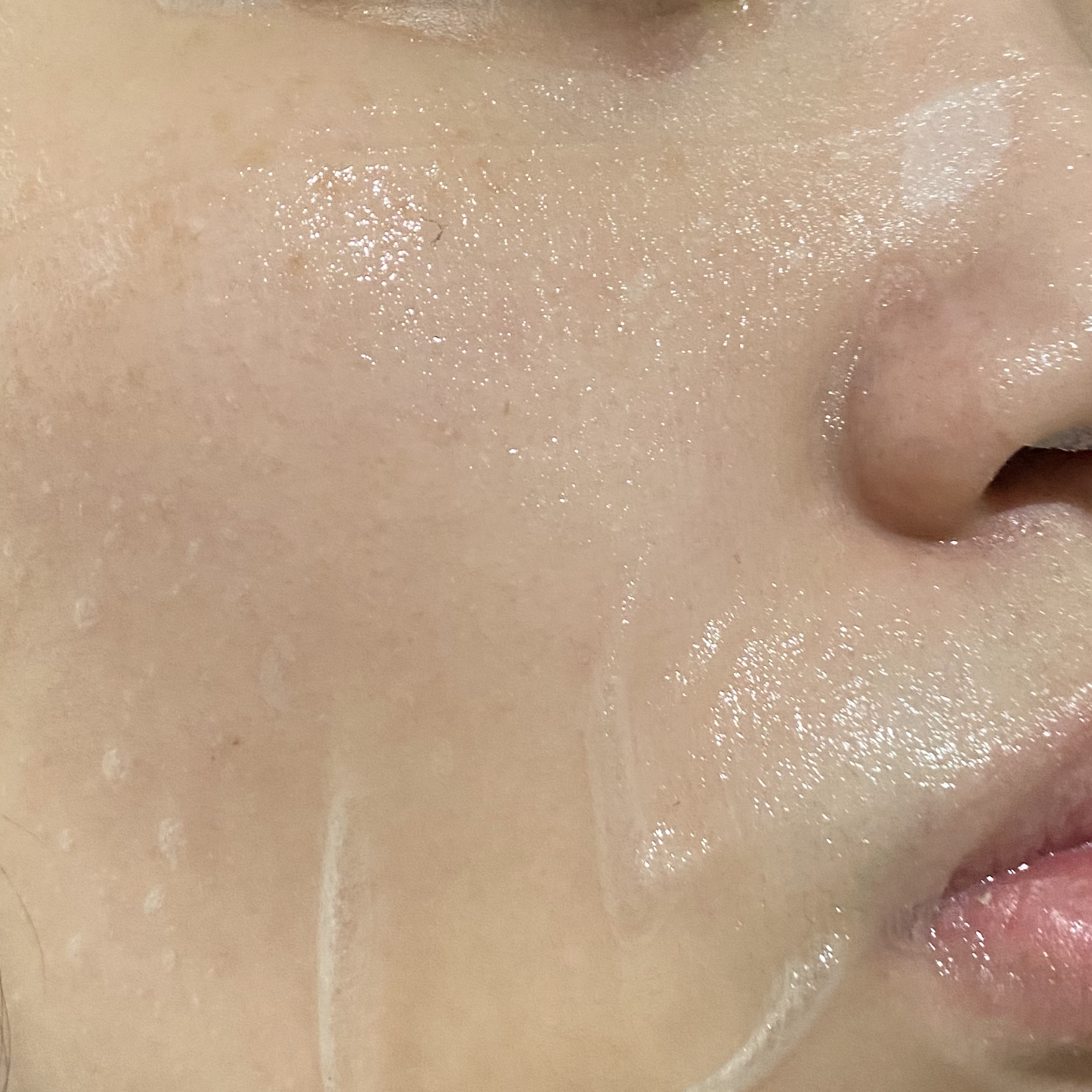 トーンアップするか否かの確認が漏れていて、無色透明のつもりで購入。開封時にパッケージを見てトーンアップやん!?!?となりました。しかしトーンアップと言っても艶で明るく見える程度の仕上がりで好みでした。 無色透明の方がベースメイク前に仕込むのに使いやすく、そのまま首やボディも塗れちゃうので手軽なんですよね。 塗りたては少しべたつくものの、時間が経つとベタつきは感じずしっとりとした触り心地に。
