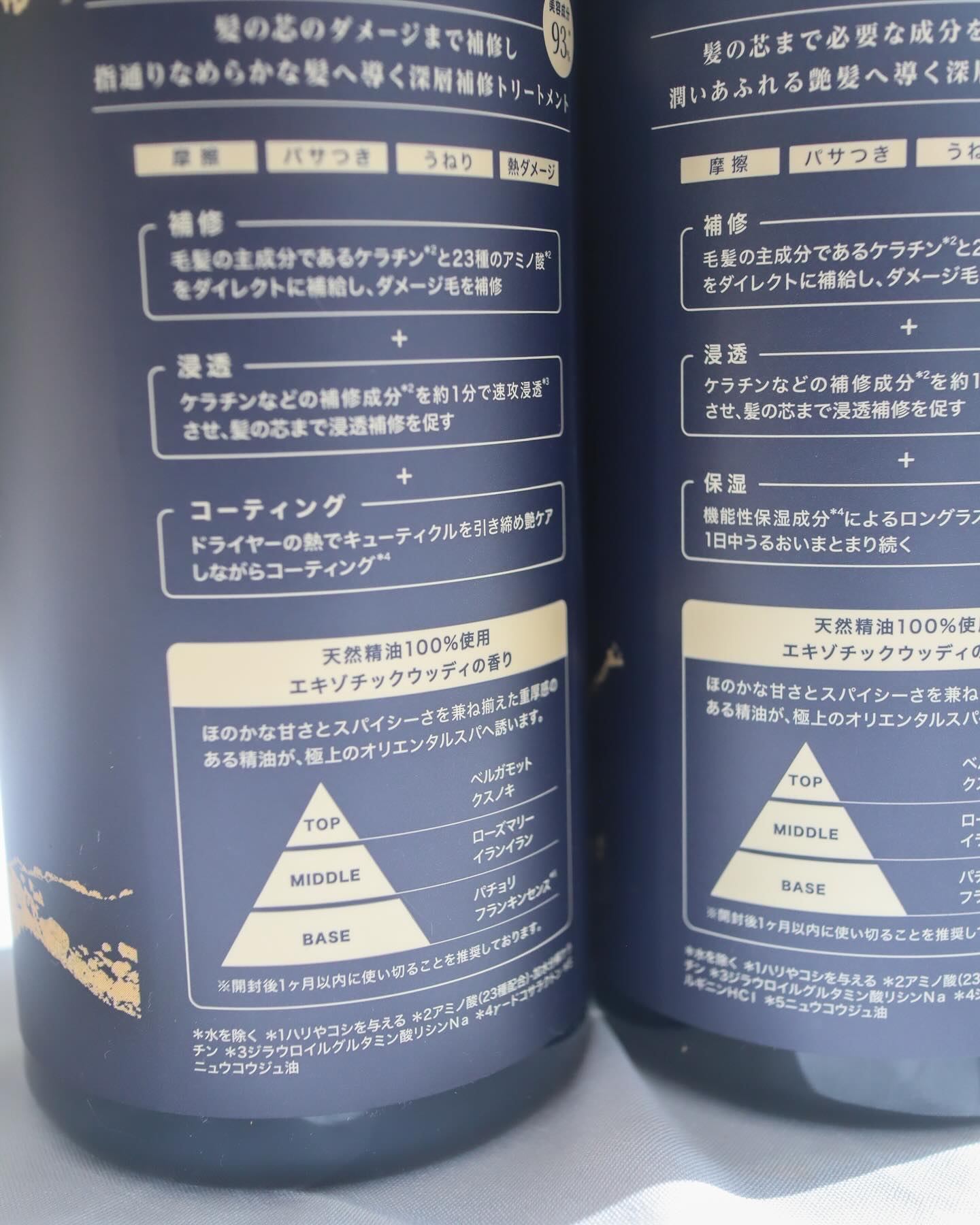 髪の芯まで栄養と潤いを届ける深層補修シャンプーです。 気高く重厚感のあるエキゾチックウッディの香り。クレオパトラが愛したとされているほのかな甘さとスパイシーさを兼ね備えるイランイランやフランキンセンス、重厚感のあるパチョリなどの濃密な香りとのこと。 泡立ちはふわふわの泡で、泡切れもいいです。重たさを感じない使用感のいいシャンプーだと思いました。