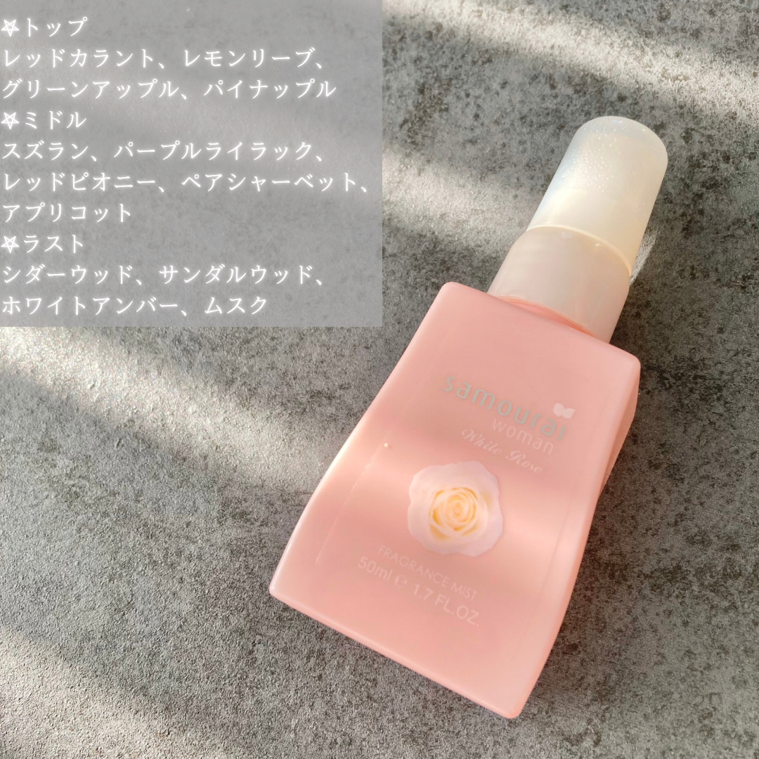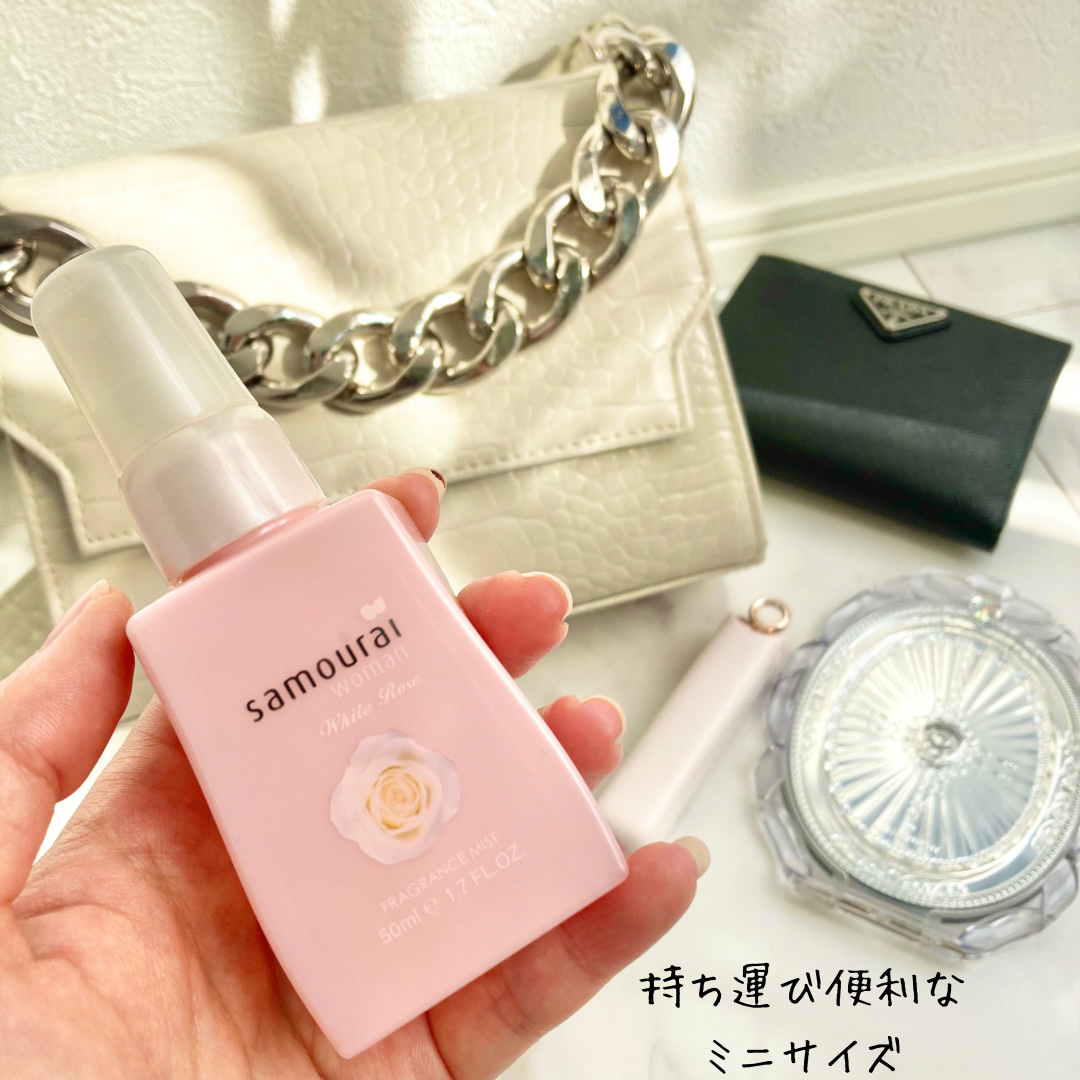 - <150ml> サムライウーマンシリーズの大ヒット香水「サムライウーマン ホワイトローズ」の香りがミストタイプで新登場♪人気の香りをライトに香って、ライトに使って、ライトに買って♪強すぎず、ふんわり香るので、車内や狭い空間でも周りを気にせず気分UP。デート前の待ち合わせ、学校やオフィス、スポーツ後に、お出かけ前の身だしなみ、髪にも使えて気軽に香りをチャージ。 <50ml> 大ヒット中のフレグランスミストシリーズが便利なミニサイズになって新登場。ヘアにもボディにも使用可能。いつでもどこでも気軽に使える優しく可憐な香り。