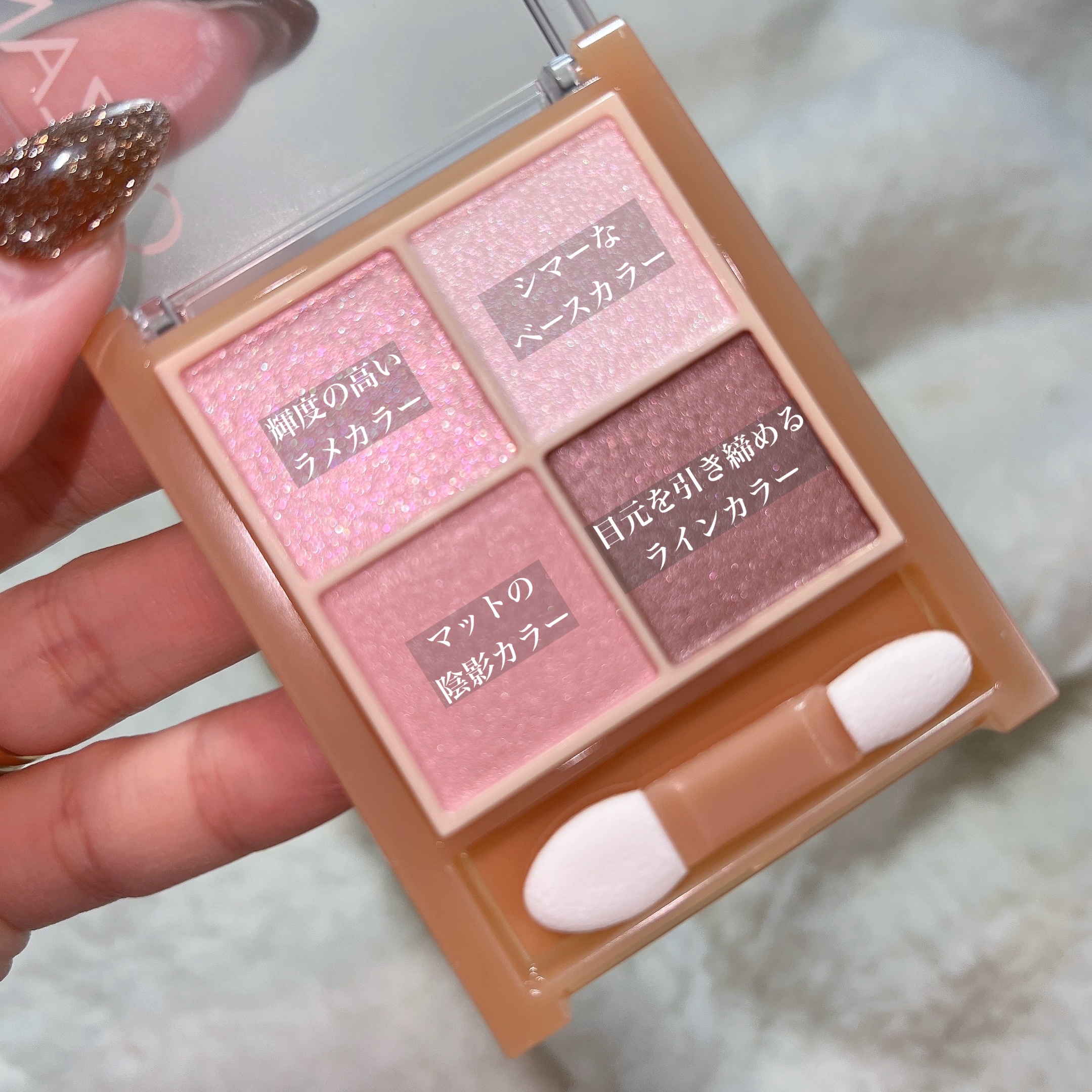 - ラメ・パール・マット3質感の4色アイシャドウ。 肌馴染みの良いベージュを基調としたカラー。ラメ・パール・マットの3質感を重ねて、自然にまぶたを強調し奥行のある大きな目元へ。 しっとり溶け込むような柔らかなパウダーなので、スルスル伸びてまぶたにピタッと密着。保湿成分(スクワラン・ホホバ種子油)配合。