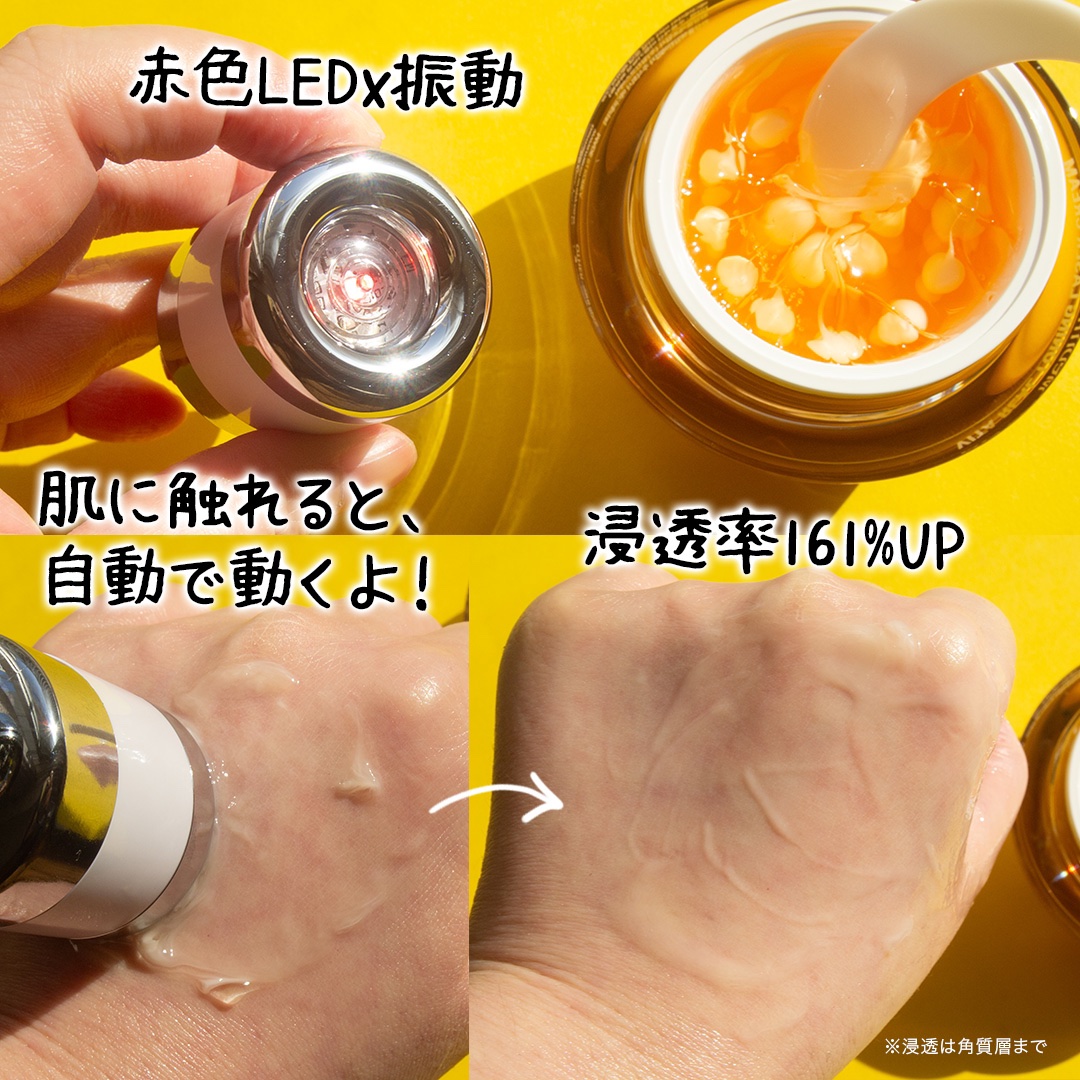 ビタミンCだけでなくトラネキサム酸も配合でシミケアが可能ですし、ビタミンB3のナイアシンアミドで美白のケアまで出来るという文句なし処方❣️🥰 白いカプセルは、ビタミンが凝縮されていて、ジェルにはヒアルロン酸などの保湿成分が配合されているようです☺️ 美顔器も細かい振動が心地よいですよ❣️
