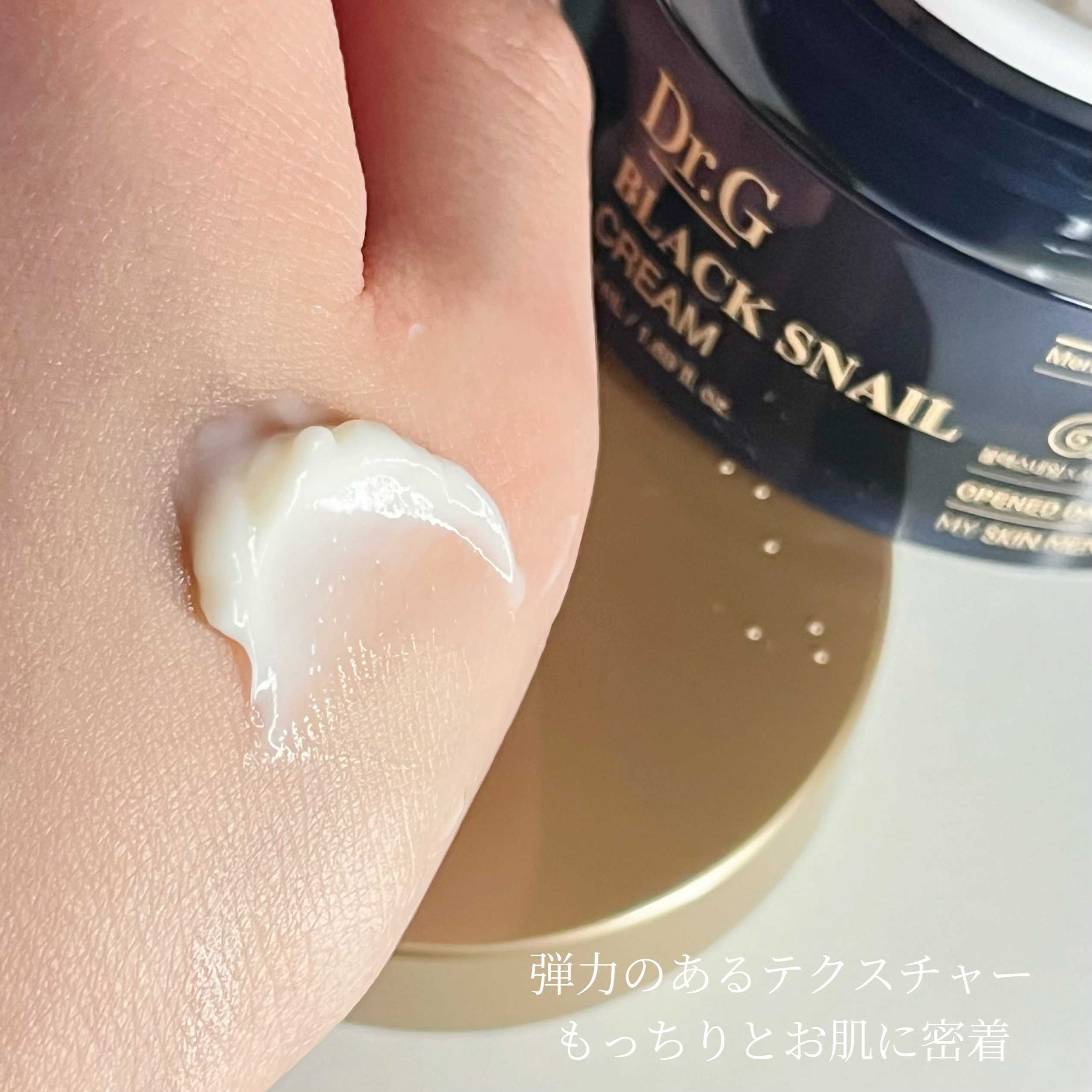 高級感のあるパッケージながらお財布に優しい価格帯 Dr.G BLACK SNAIL CREAM 濃厚クリームが特徴的です テクスチャもっちり弾力があって保湿ケアにも使いやすい! ピッタリ肌に密着してくれところが冬のスキンケアにも◎