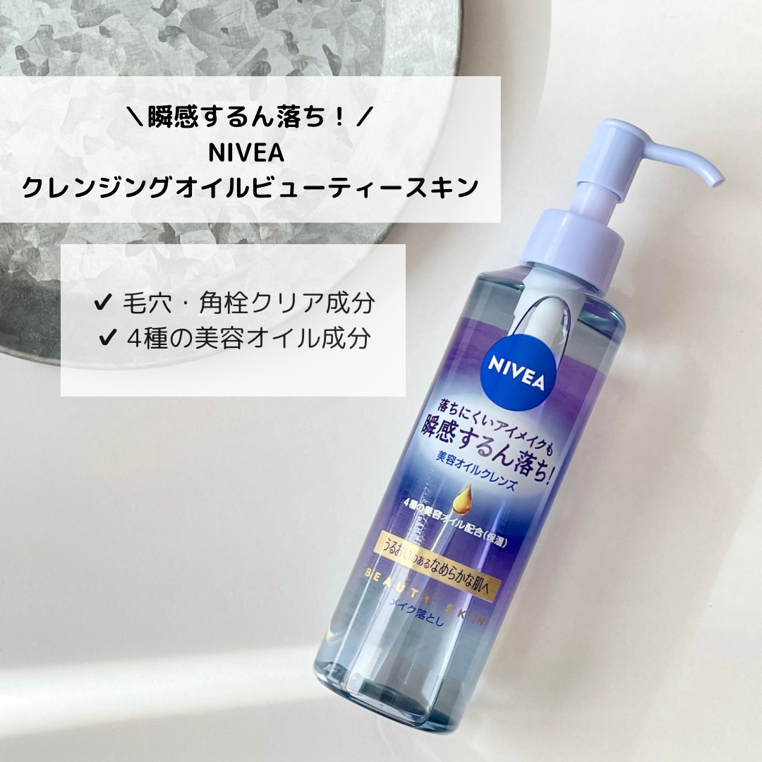 NIVEA💜クレンジングオイルビューティースキン.4種の美容オイル成分、毛穴・角栓クリア成分配合。やすらぐリラクシングアロマの香り。濡れた手でも使えます。.リキッドのようなサラッとしたテクスチャーで、肌に馴染ませると、角栓がポロポロ落ちます😳...