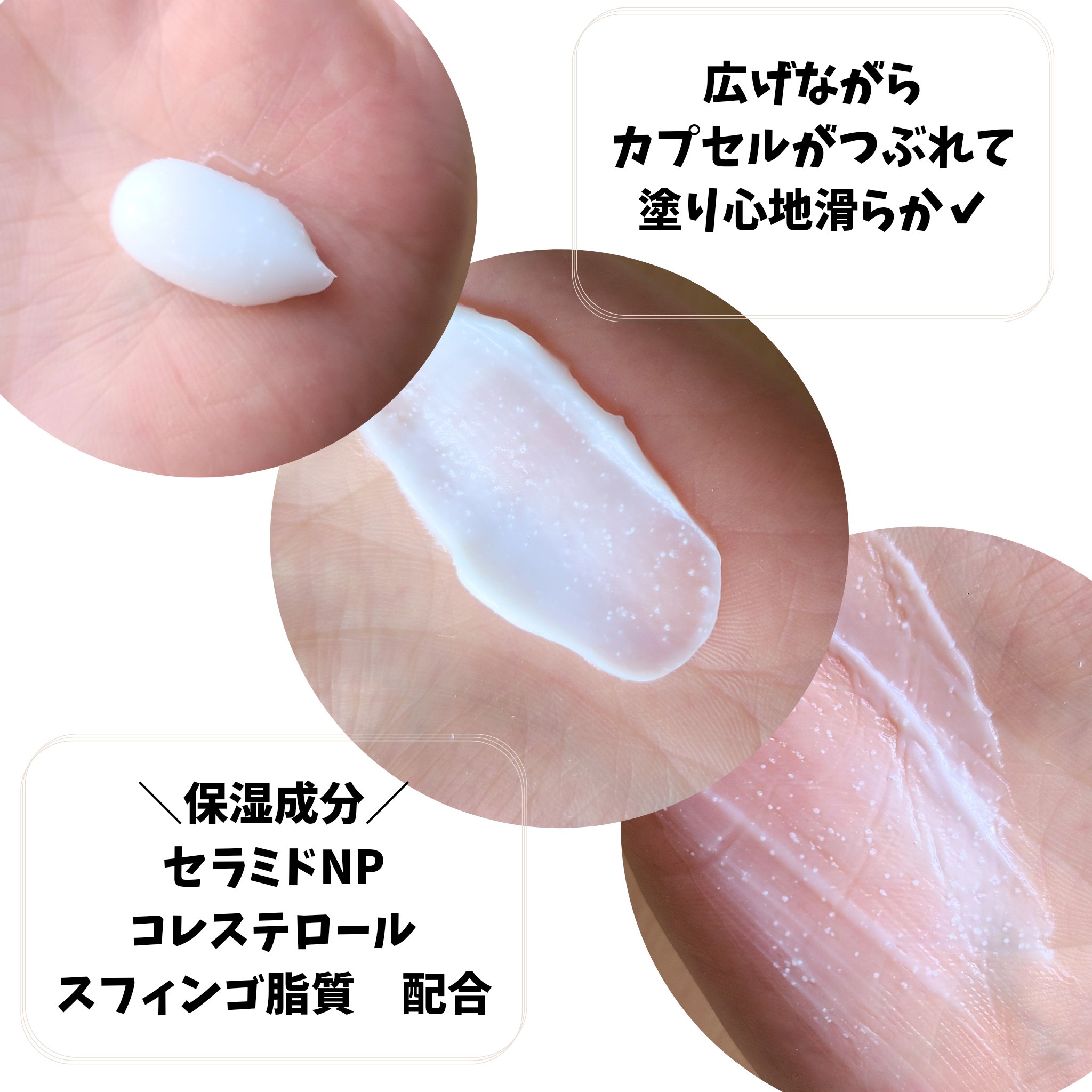 - 独自技術を用いた「高密度セラミドカプセル*¹」を1本に約100万個配合しそのつぶつぶと目に見えるカプセルが肌上で柔らかく溶けて角質層のすみずみまでうるおいで満たします。 保湿が120時間*⁵持続することでも人気を博しており乾燥しやすい敏感な肌におすすめのクリームです。 無香料、無着色、パラベン無添加、エタノール無添加、皮膚科医の協力のもとテスト済み*⁶ *1 セラミドNP、スフィンゴ脂質、ヒドロキシプロピルビスパルミタミドMEA、コレステロール、ステアリン酸、アラキン酸、オレイン酸、パルミチン酸 *5 ㈱エリード 2023.2.20~2023.3.23 敏感肌で乾燥悩みのある女性32人対象の人体適用試験実施(個人差があります) *6 全ての人に肌トラブル、アレルギーがおきないわけではありません。