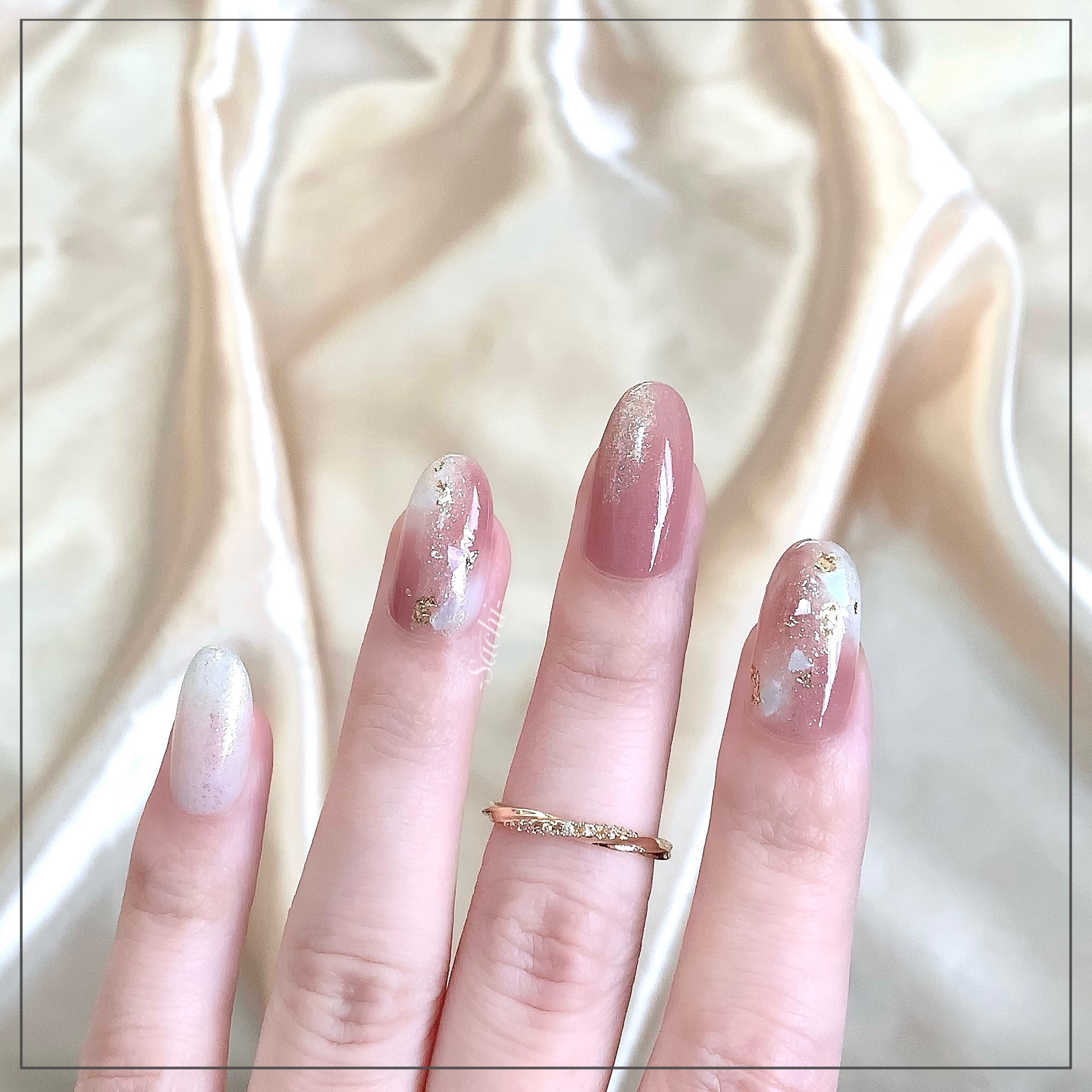 ワンカラーでも指ごとに色を変えるだけでオシャレに見えます💕 画像のようにゴールドラインとストーンを少し足すだけで華やかさがアップ🥰 何度かご紹介したことのあるスポンジで作るグラデーションです✨ スポンジを使うことで境目が綺麗に馴染んでくれます💕 アルミホイルの上でブラウンとトップコートを1:1くらいで混ぜたものを、トップコートのハケに取って3箇所に塗るだけ👌 事前に混ぜたものを塗ることで、爪の上でぼかすより簡単に出来ます💕 ベースカラーが乾く前に点置きしてぼかすことで綺麗にぼかせます✨ スピードが大事なので、使うポリッシュのキャップは全て開けておきましょう😊 天然石のラインはガタガタの方がより天然石っぽく見えるので、ラインを描くのが苦手な方でも大丈夫🙆♀️ 難しそうに見えて、やってみると意外と簡単に出来ます♡