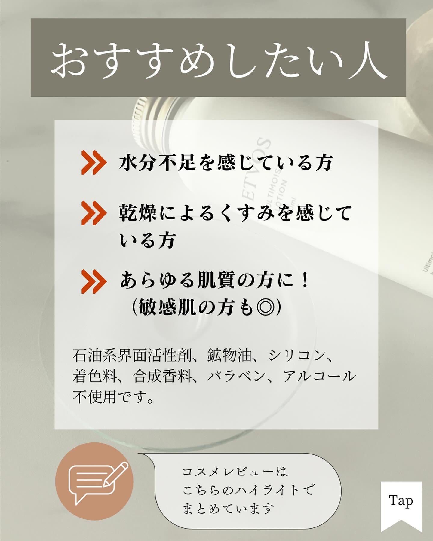 | シャバシャバしたテクスチャーで、重ね付けしても肌なじみが良いです。さっぱりとした使い心地。 | 詳細を見る | ||