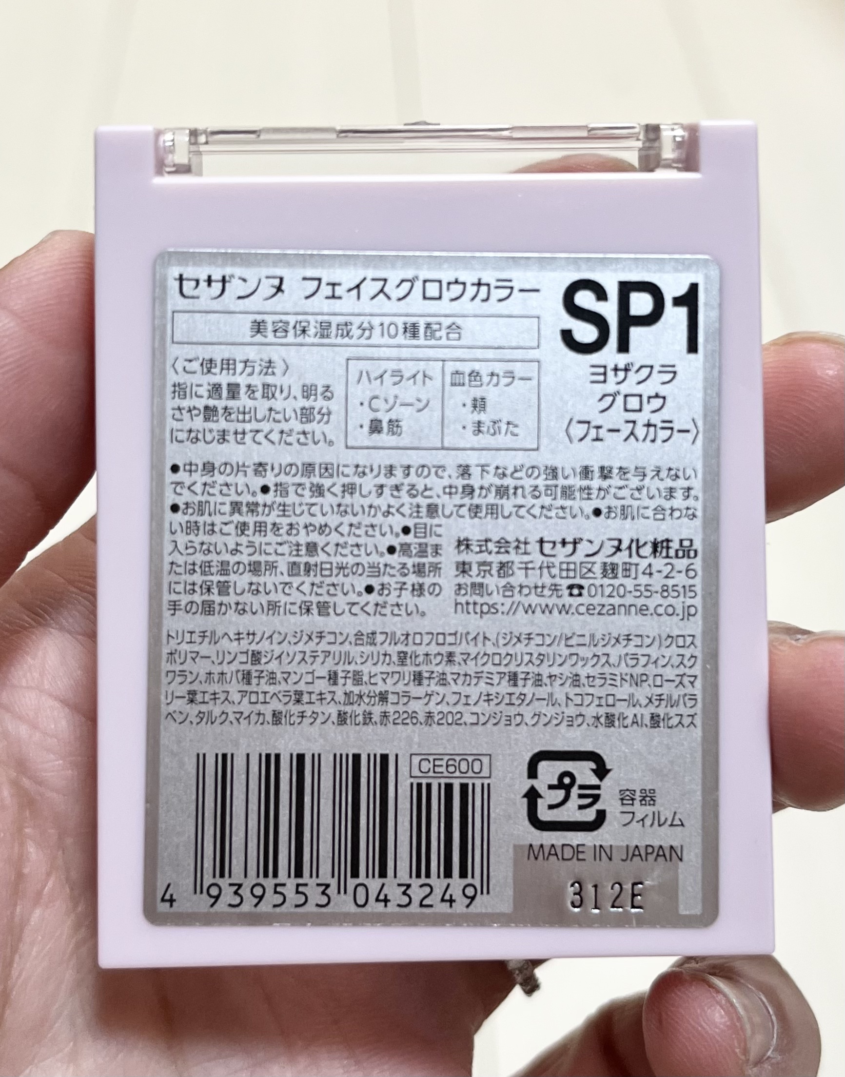 - <01 アプリコットグロウ> トリエチルヘキサノイン、ジメチコン、合成フルオロフロゴパイト、(ジメチコン/ビニルジメチコン)クロスポリマー、リンゴ酸ジイソステアリル、シリカ、窒化ホウ素、マイクロクリスタリンワックス、パラフィン、スクワラン、ホホバ種子油、マンゴー種子脂、ヒマワリ種子油、マカデミア種子油、ヤシ油、セラミドNP、ローズマリー葉エキス、アロエベラ葉エキス、加水分解コラーゲン、フェノキシエタノール、トコフェロール、メチルパラベン、タルク、マイカ、酸化チタン、酸化鉄、赤226、コンジョウ、水酸化Al、酸化スズ <02 ローズグロウ> トリエチルヘキサノイン、ジメチコン、合成フルオロフロゴパイト、(ジメチコン/ビニルジメチコン)クロスポリマー、リンゴ酸ジイソステアリル、シリカ、窒化ホウ素、マイクロクリスタリンワックス、パラフィン、スクワラン、ホホバ種子油、マンゴー種子脂、ヒマワリ種子油、マカデミア種子油、ヤシ油、セラミドNP、ローズマリー葉エキス、アロエベラ葉エキス、加水分解コラーゲン、フェノキシエタノール、トコフェロール、メチルパラベン、タルク、マイカ、酸化チタン、酸化鉄、赤226、コンジョウ、水酸化Al、酸化スズ、赤202 <03 ロマンスグロウ> トリエチルヘキサノイン、ジメチコン、合成フルオロフロゴパイト、(ジメチコン/ビニルジメチコン)クロスポリマー、リンゴ酸ジイソステアリル、シリカ、窒化ホウ素、マイクロクリスタリンワックス、パラフィン、スクワラン、ホホバ種子油、マンゴー種子脂、ヒマワリ種子油、マカデミア種子油、ヤシ油、セラミドNP、ローズマリー葉エキス、アロエベラ葉エキス、加水分解コラーゲン、フェノキシエタノール、トコフェロール、メチルパラベン、タルク、マイカ、酸化チタン、酸化鉄、赤226、コンジョウ、水酸化Al、酸化スズ、赤202 <SP1 ヨザクラグロウ> トリエチルヘキサノイン、ジメチコン、合成フルオロフロゴパイト、(ジメチコン/ビニルジメチコン)クロスポリマー、リンゴ酸ジイソステアリル、シリカ、窒化ホウ素、マイクロクリスタリンワックス、パラフィン、スクワラン、ホホバ種子油、マンゴー種子脂、ヒマワリ種子油、マカデミア種子油、ヤシ油、セラミドNP、ローズマリー葉エキス、アロエベラ葉エキス、加水分解コラーゲン、フェノキシエタノール、トコフェロール、メチルパラベン、タルク、マイカ、酸化チタン、酸化鉄、赤226、赤202、コンジョウ、グンジョウ、水酸化Al、酸化スズ