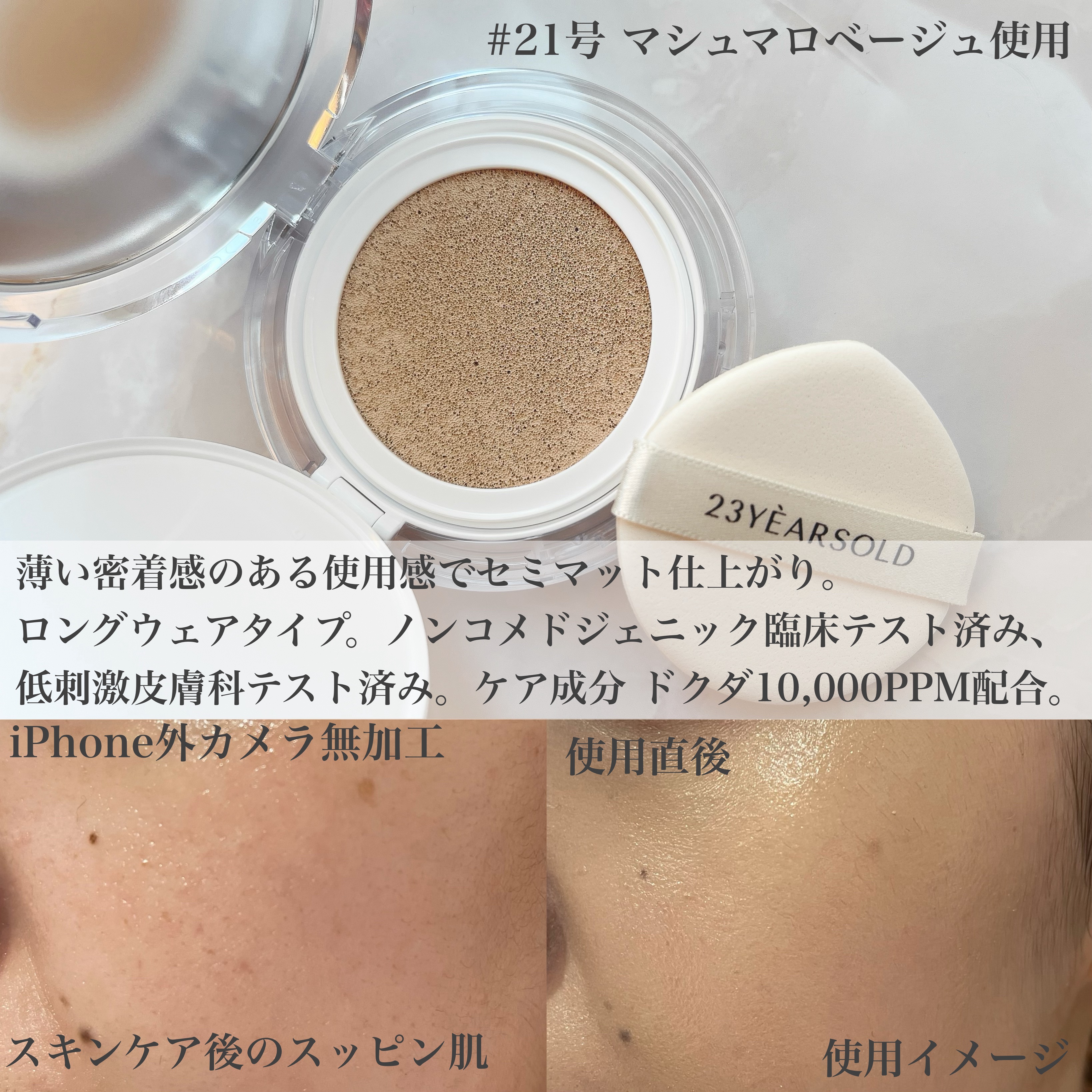 - <21 マシュマロベージュ> 水、シクロペンタシロキサン、酸化チタン、メトキシケイヒ酸エチルヘキシル、サリチル酸オクチル、BG、メチルトリメチコン、イソドデカン、ナイアシンアミ ド、ラウリルポリグリセリル-3ポリジメチルシロキシエチルジメチコン、サ リチル酸ブチルオクチル、オクトクリレン、酸化亜鉛、ポリリシノレイン酸ポリ グリセリル-3、トリメチルシロキシケイ酸、ドクダミエキス、硫酸Mg、ポリ グリセリル-3ポリジメチルシロキシエチルジメチコン、クオタニウム-90ベ ントナイト、(カプリル酸/カプリン酸)グリセリズ、シリカ、ポリメチルシルセ スキオキサン、(アクリレーツ/メタクリル酸ポリトリメチルシロキシ)コポリ マー、(トリメチルシロキシケイ酸/ジメチコノール)クロスポリマー、水酸化A 1、トリエトキシカプリリルシラン、リシノレイン酸ポリグリセリル-3, ステ アリン酸、アデノシン、プルラン、フルクトオリゴ糖、1,2-ヘキサンジオール、グリセリン、チャ葉エキス、トリ(カプリル/カプリン酸)グリセリル、ẞーグ ルカン、マルトデキストリン、コラーゲン、水添レシチン、レウコノストック/ダ イコン根発酵液、マスチック樹脂、ヒアルロン酸Na、ユビキノン、ティーツリ ーエキス、マデカッソシド、アシアチコシド、マデカシン酸、アシアチン酸、酸化 チタン (CI 77891)、CI 77492、CI 77491、CI 77499 <23 バターベージュ> 水、シクロペンタシロキサン、酸化チタン、メトキシケイヒ酸エチルヘキシル、サリチル酸オクチル、BG、メチルトリメチコン、イソドデカン、ナイアシンアミ ド、ラウリルポリグリセリル-3ポリジメチルシロキシエチルジメチコン、サ リチル酸ブチルオクチル、オクトクリレン、酸化亜鉛、ポリリシノレイン酸ポリ グリセリル-3、トリメチルシロキシケイ酸、ドクダミエキス、硫酸Mg、ポリ グリセリル-3ポリジメチルシロキシエチルジメチコン、クオタニウム-90ベ ントナイト、(カプリル酸/カプリン酸)グリセリズ、シリカ、ポリメチルシルセ スキオキサン、(アクリレーツ/メタクリル酸ポリトリメチルシロキシ)コポリ マー、(トリメチルシロキシケイ酸/ジメチコノール)クロスポリマー、水酸化A 1、トリエトキシカプリリルシラン、リシノレイン酸ポリグリセリル-3, ステ アリン酸、アデノシン、プルラン、フルクトオリゴ糖、1,2-ヘキサンジオール、グリセリン、チャ葉エキス、トリ(カプリル/カプリン酸)グリセリル、ẞーグ ルカン、マルトデキストリン、コラーゲン、水添レシチン、レウコノストック/ダ イコン根発酵液、マスチック樹脂、ヒアルロン酸Na、ユビキノン、ティーツリ ーエキス、マデカッソシド、アシアチコシド、マデカシン酸、アシアチン酸、酸化 チタン (CI 77891)、CI 77492、CI 77491、CI 77499