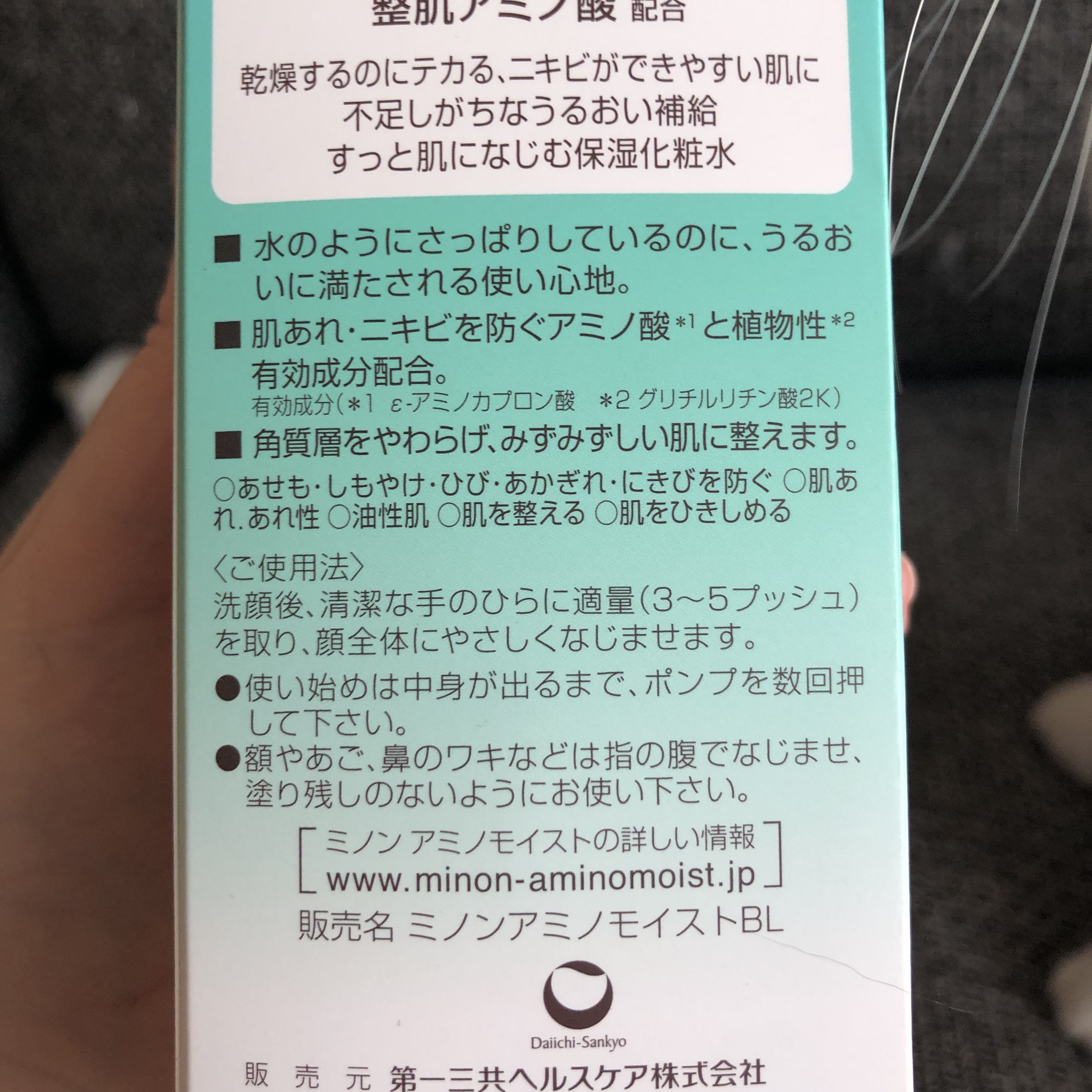 - 乾燥もテカりも気になる肌にすっとなじんでうるおい補給 水のようにさっぱりしているのに、うるおいに満たされる使い心地。 肌あれ・ニキビを防ぐアミノ酸※1と植物性※2有効成分配合。 角質層をやわらげ、みずみずしい肌に整えます。 1.洗顔後、清潔な手のひらに適量(3~5プッシュ)を取ります。 2.顔全体にやさしくなじませます。 *使い始めは中身が出るまで、ポンプを数回押してください。 *中身が出しにくい時は、ポンプの向きを変えて、数回プッシュしてください。 販売名:ミノンアミノモイストBL[医薬部外品]