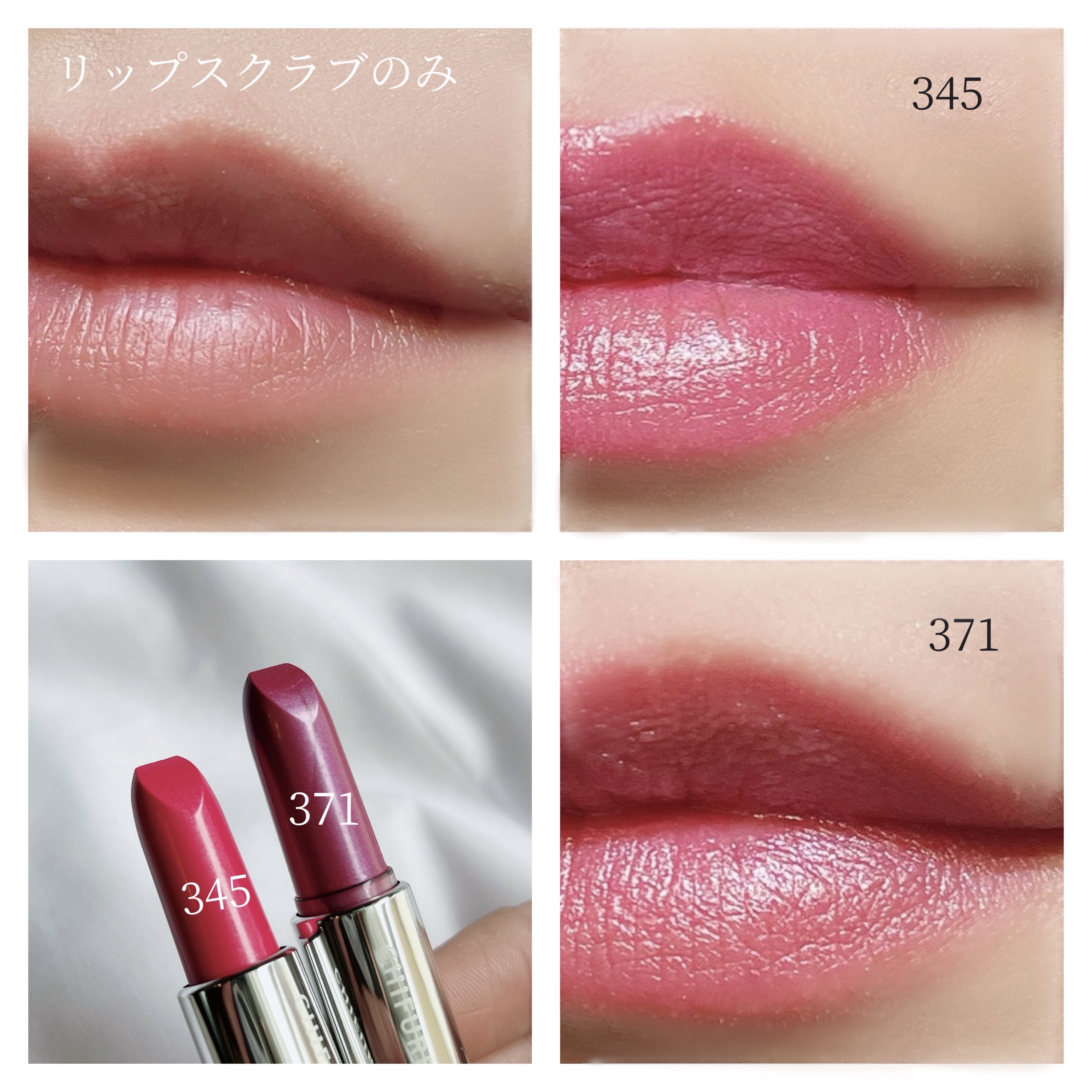 ちふれ夏パープルリップ💜★371パープル系パール★345パープル系パールどちらも夏よく使っててリピ買いもしてる。345の方が、使いやすいピンクパープル💕ただ、私的には371のパープルがバブリーで好き😂💜#chifure_口紅#ちふれ口紅詰替用...