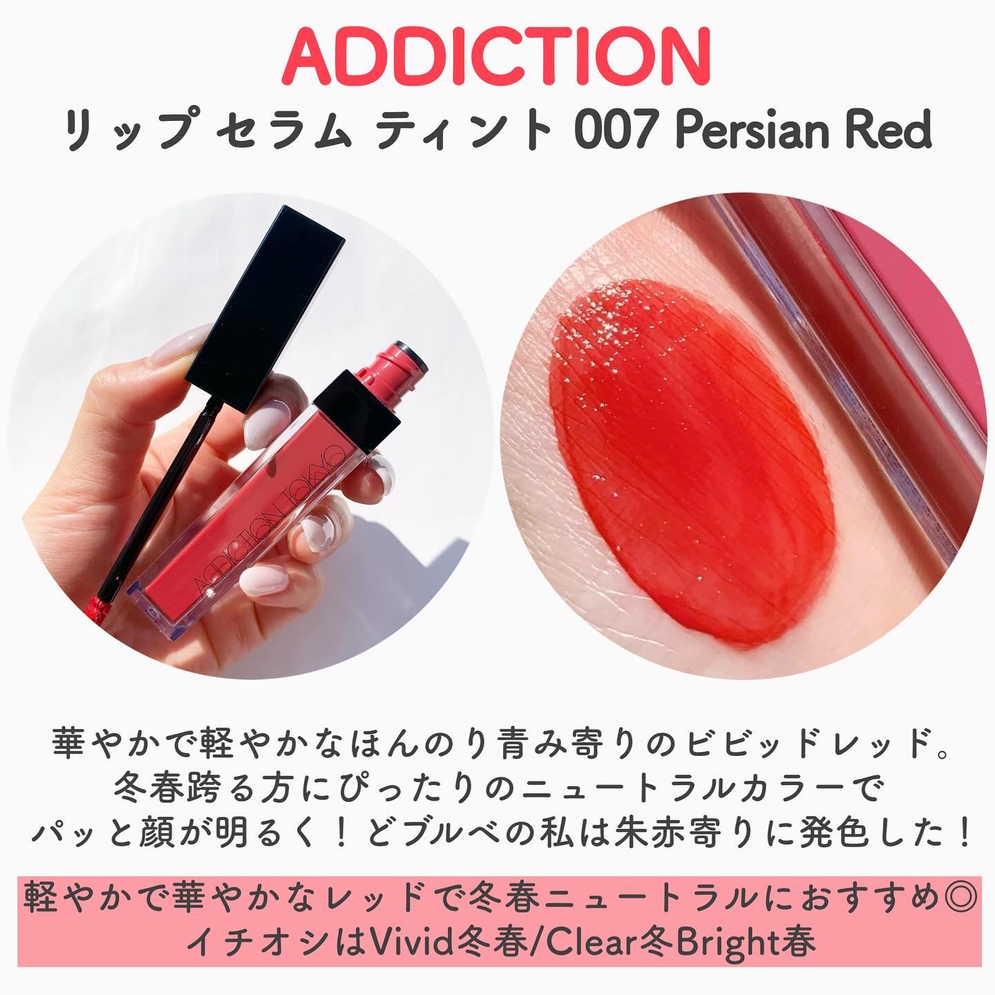 📣冬ビビさん、これドンピシャよーー‼︎‼︎アディクションの新作リップ買ってきました!ツヤツヤなのにピタッと密着する使用感で色もちもかなり良い◎014がブルベ冬にぴったりのディープレッドで個人的推し。写真よりも実際見る方がナチュラルだから使いや...