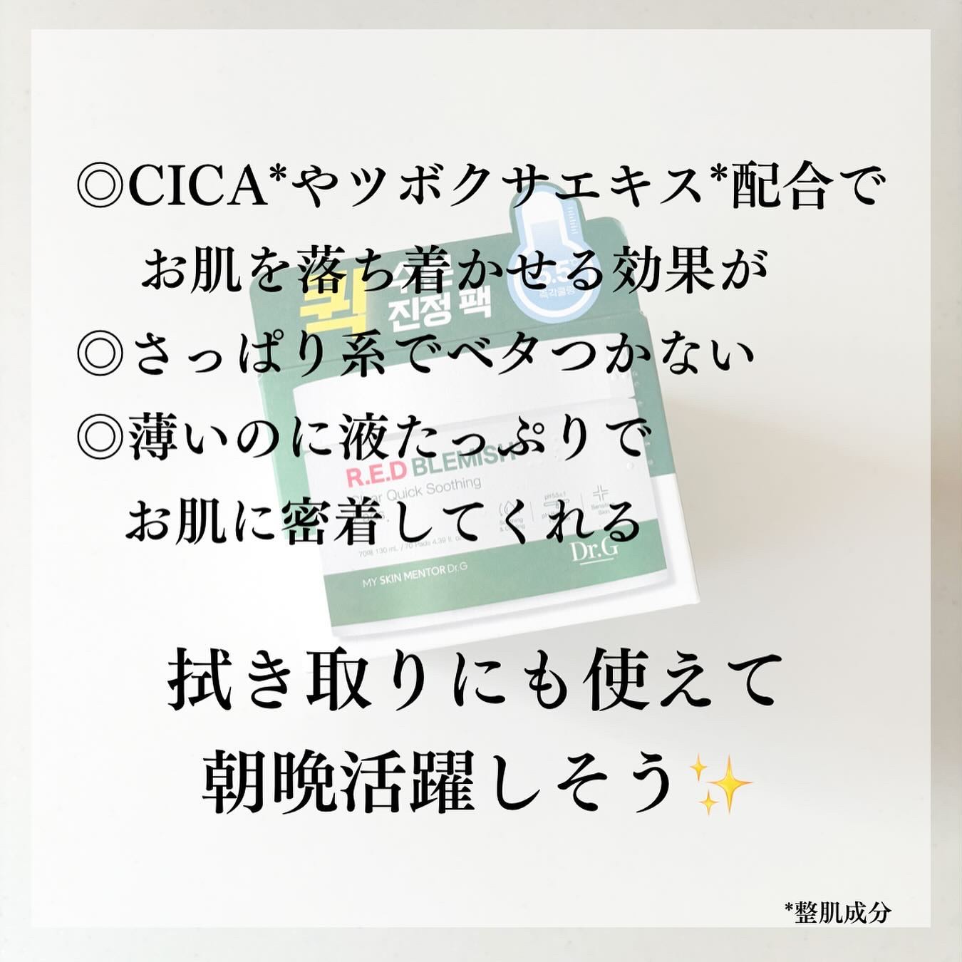 🌱メイク前の鎮静に🌱最近開封したもので1番のお気に入りアイテム😍Dr.Gレッドブレミッシュクリアクイックスージングパック70枚入り拭き取り用にも、部分パックにも✨⚪︎CICA成分が5種類配合刺激を受けた肌や、熱を持った肌の温度を下げ赤みをケア...