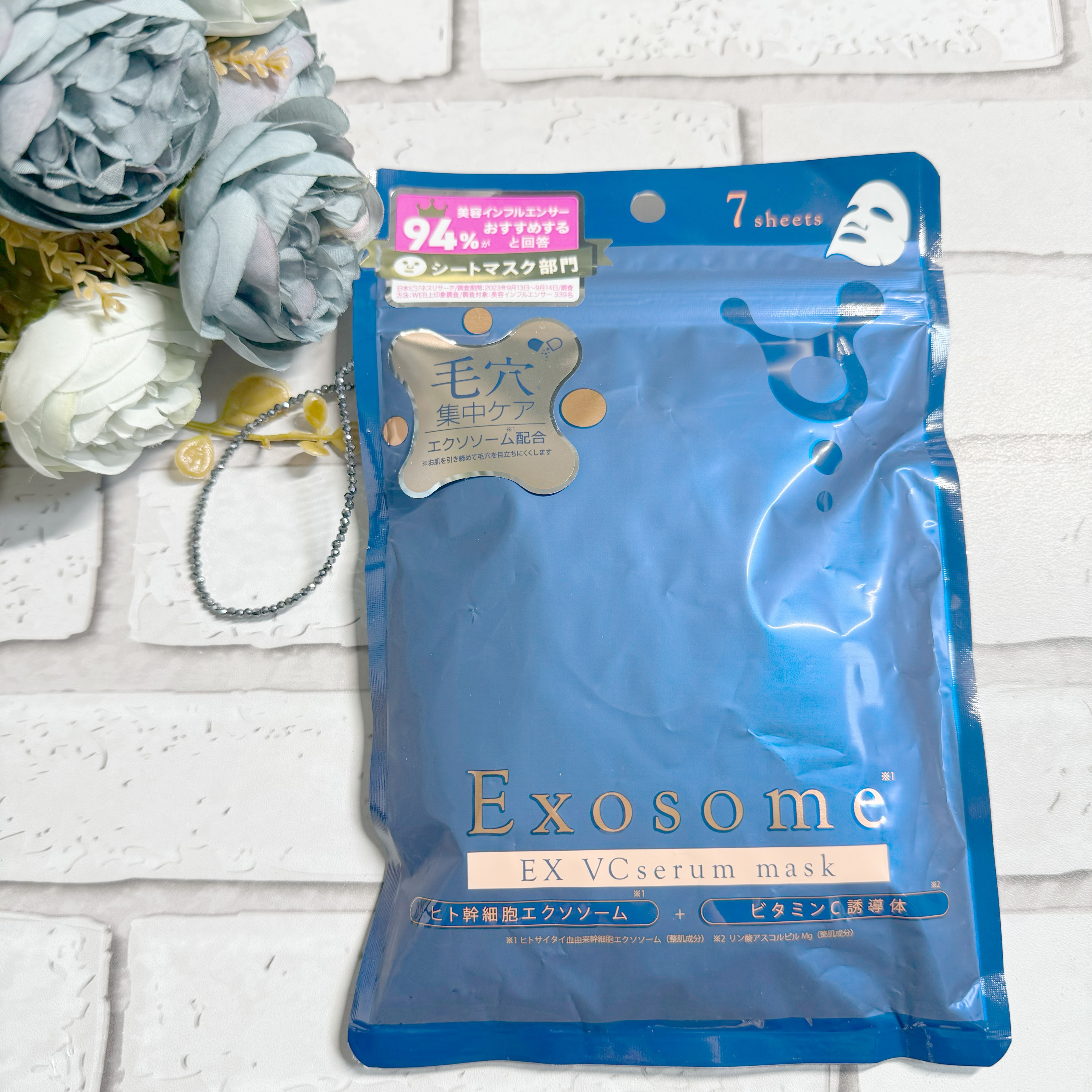 - ヒト幹細胞エクソソーム*1のシートマスク。ビタミンC誘導体*2も配合し、乾燥による毛穴ケアにおすすめです。天然コットンに液量がたっぷり浸透した贅沢シートマスクです。 *1ヒトサイタイ血由来幹細胞エクソソーム(整肌成分) *2整肌成分
